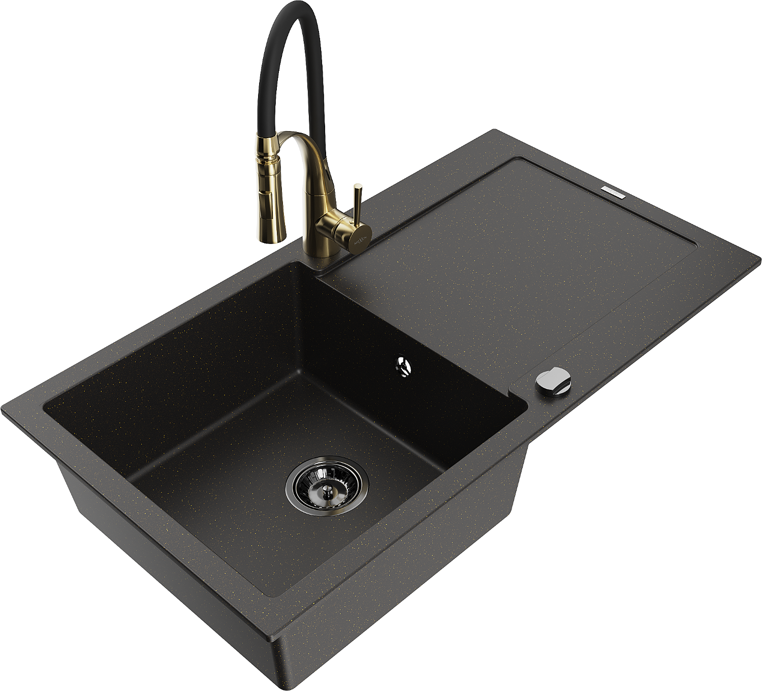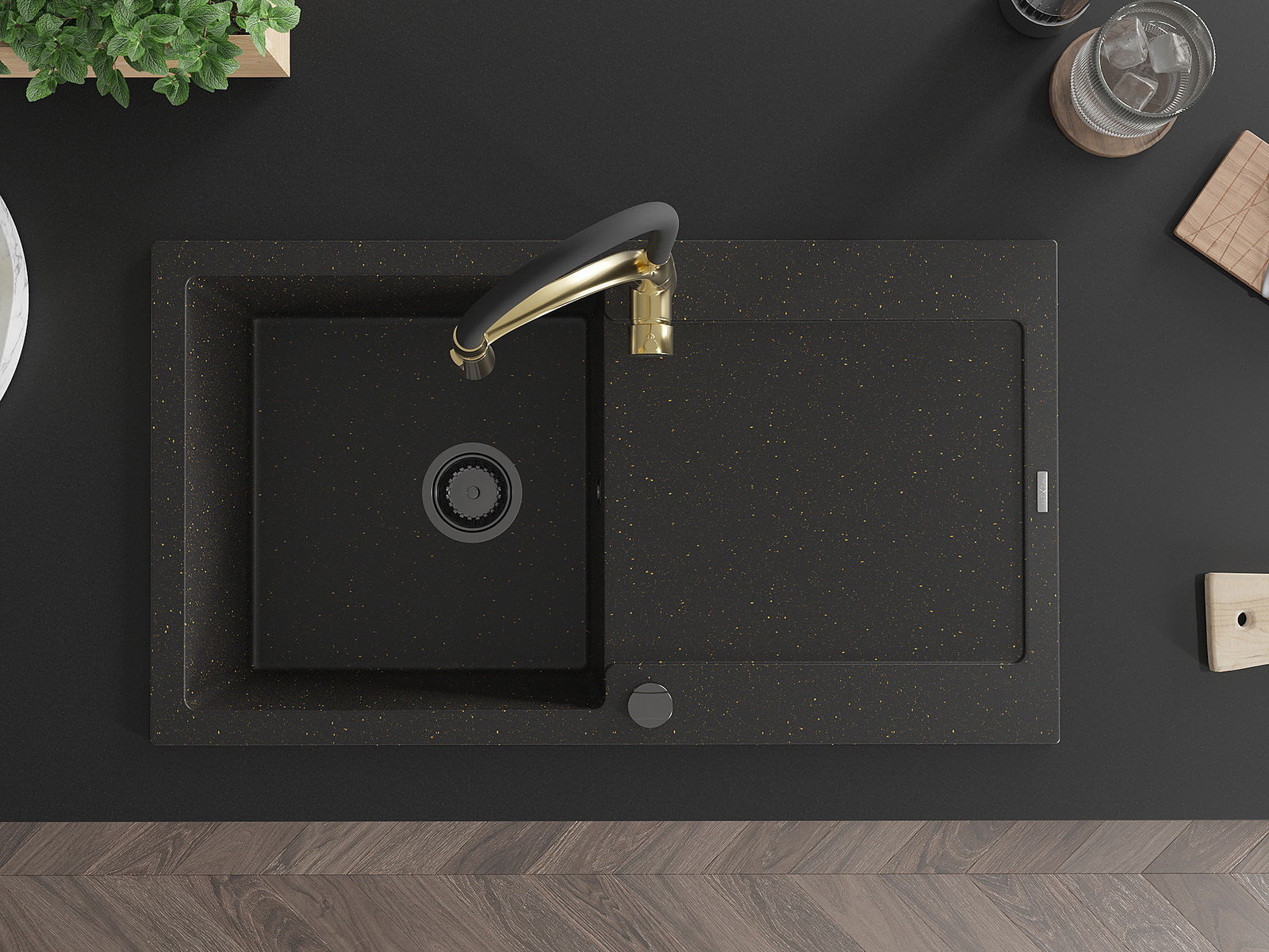 Mexen Leo lavello in granito 1-vasca con sgocciolatoio e rubinetto da cucina Aster, nero/oro metallizzato - 6501-75-73450-57-B