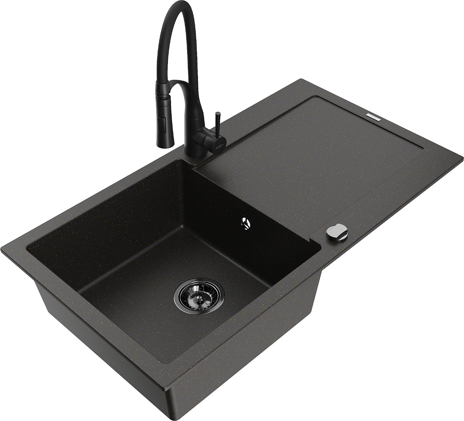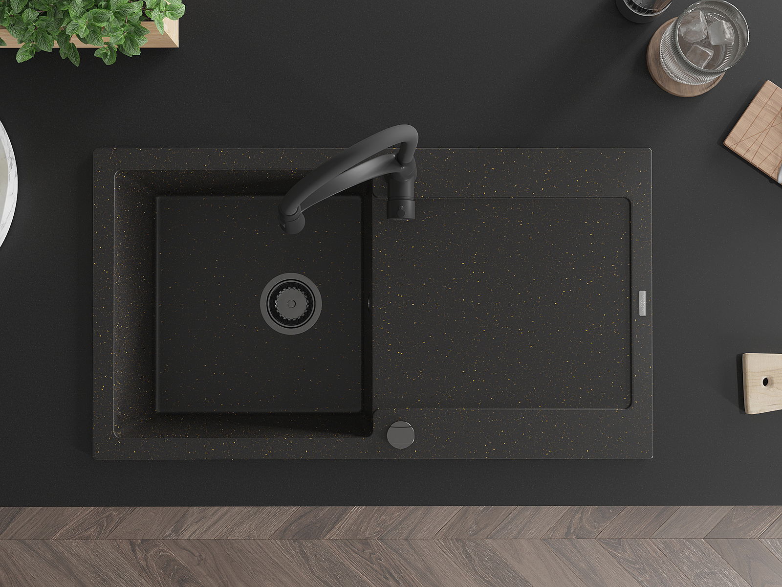 Mexen Leo lavello in granito a 1 vasca con sgocciolatoio e rubinetto da cucina Aster, nero/oro metallizzato - 6501-75-73450-70-B