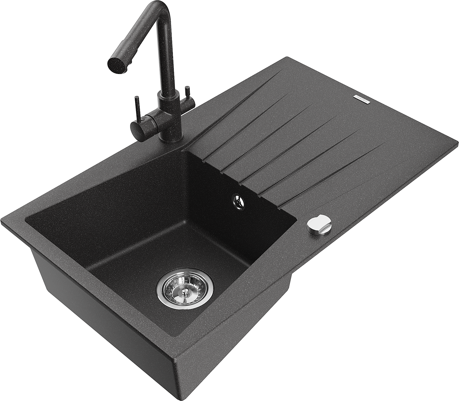 Mexen Cesar lavello in granito a 1 vasca con sgocciolatoio e rubinetto da cucina Duero, nero maculato - 6514-76-671600-76