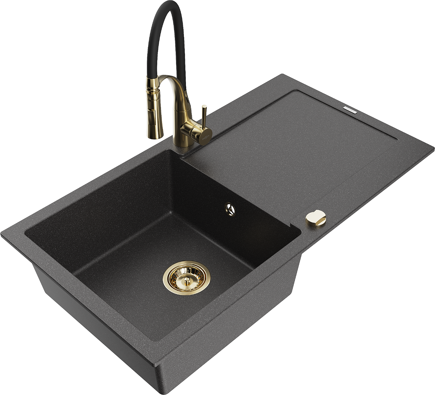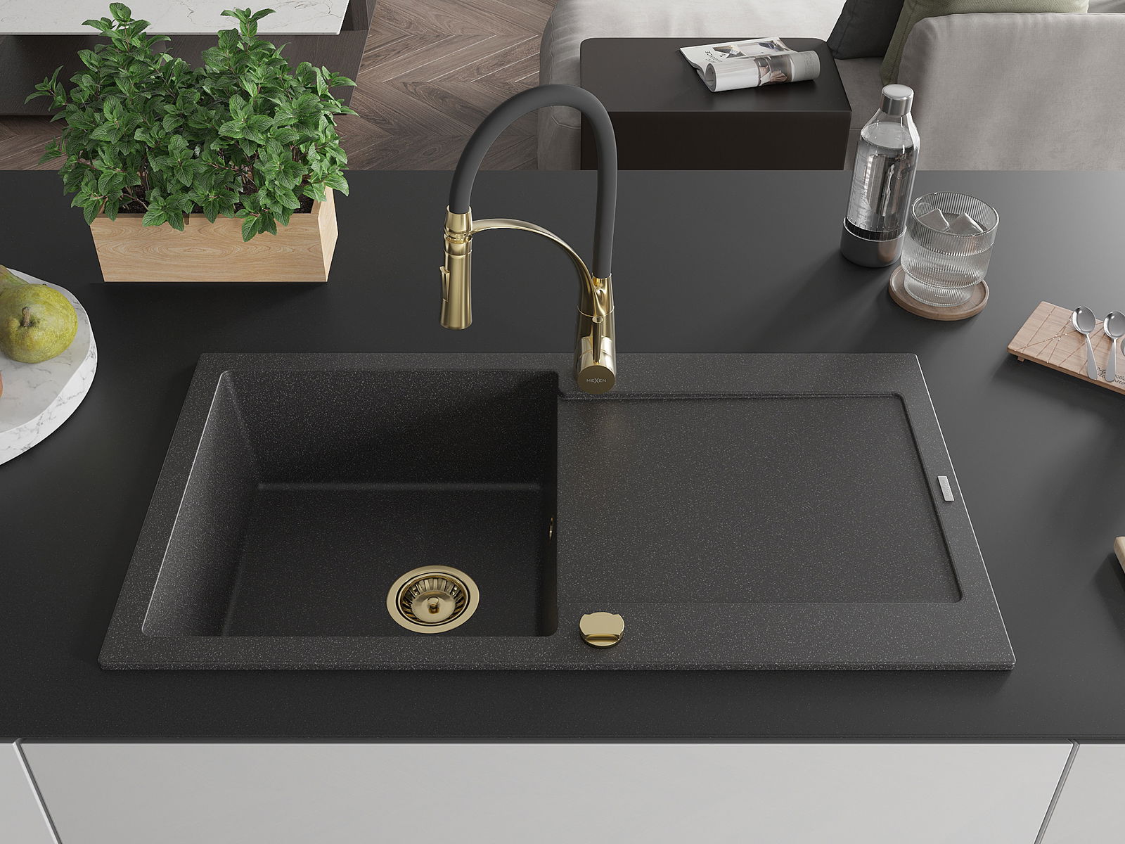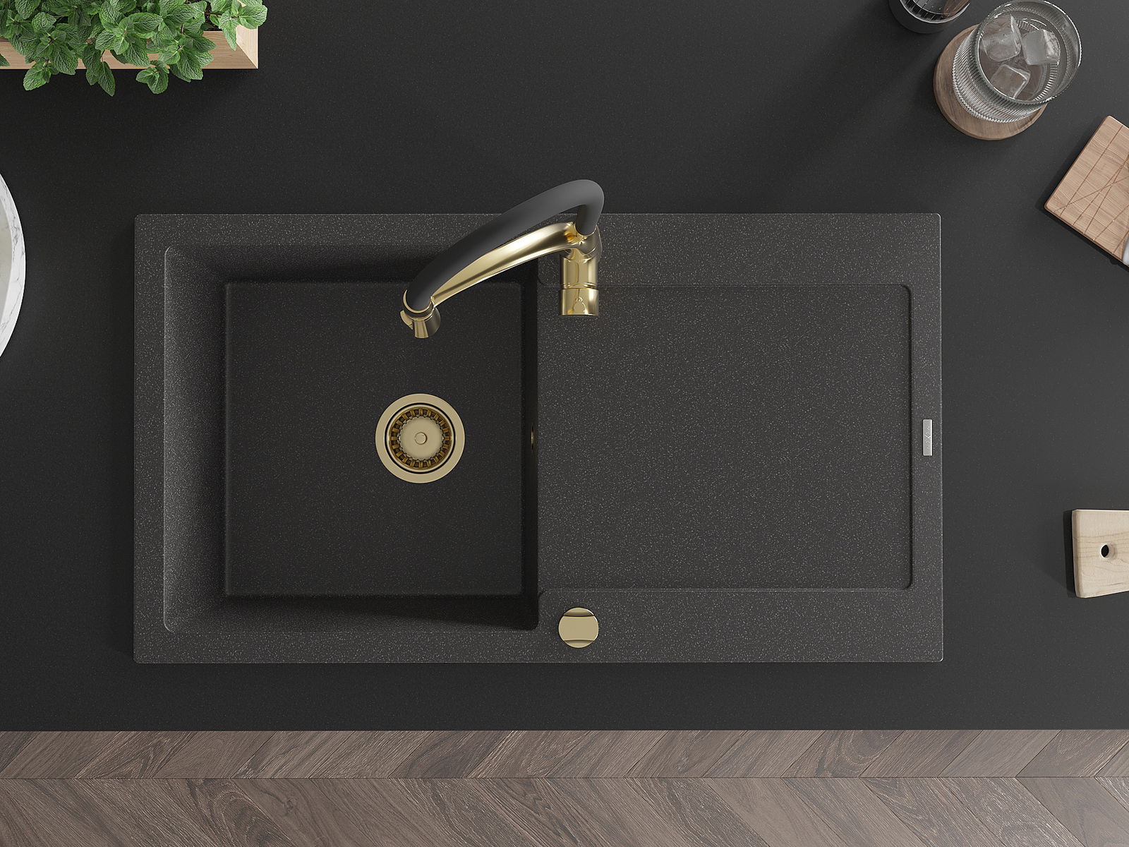 Mexen Leo lavello in granito 1 vasca con sgocciolatoio e rubinetto da cucina Aster, nero punteggiato - 6501-76-73450-57-G