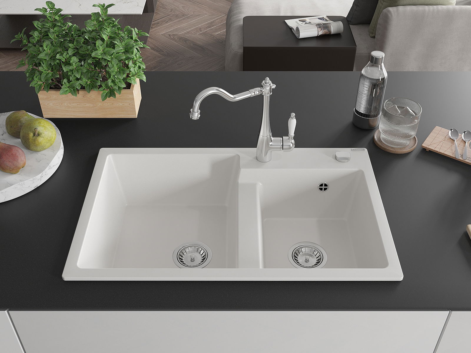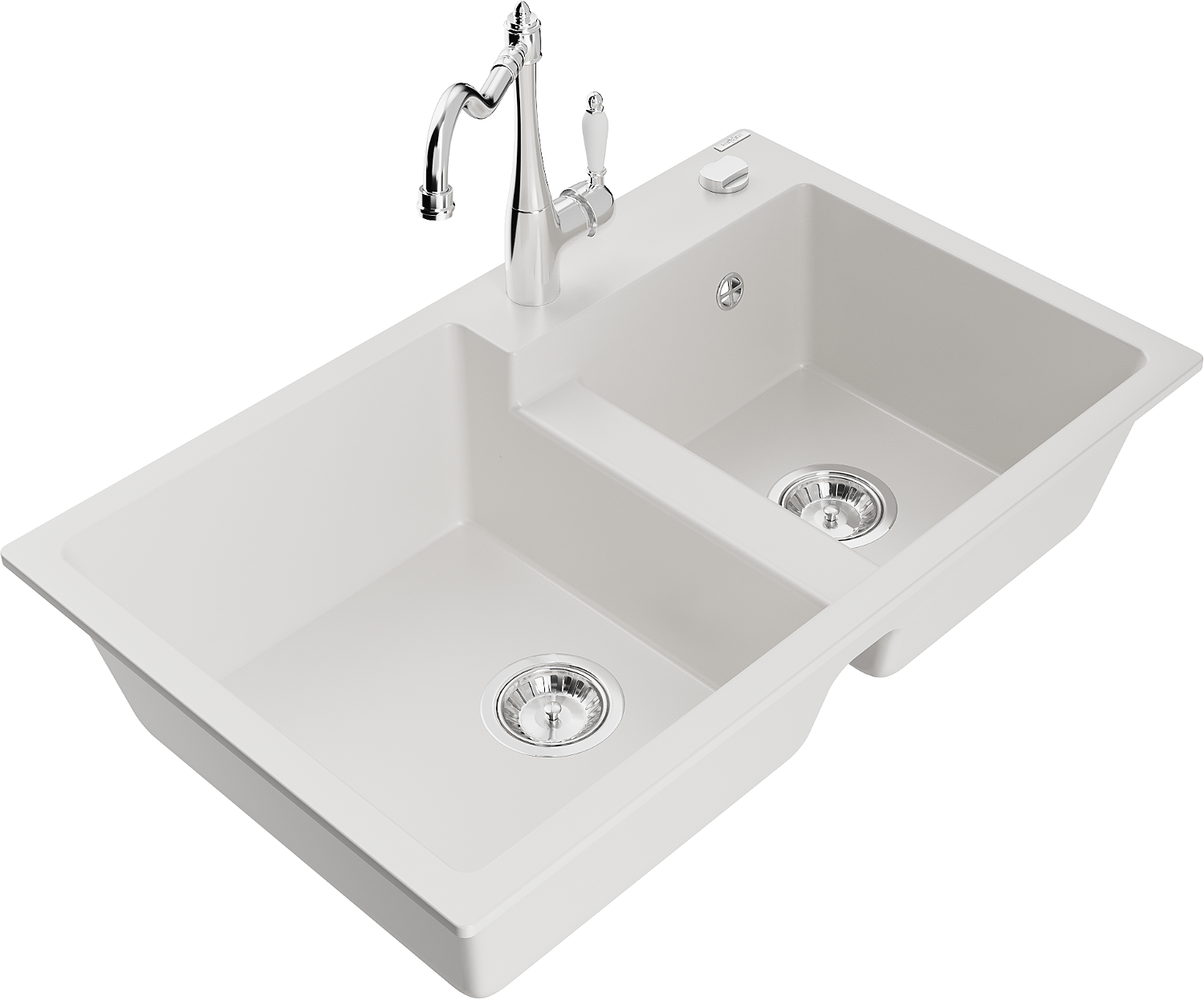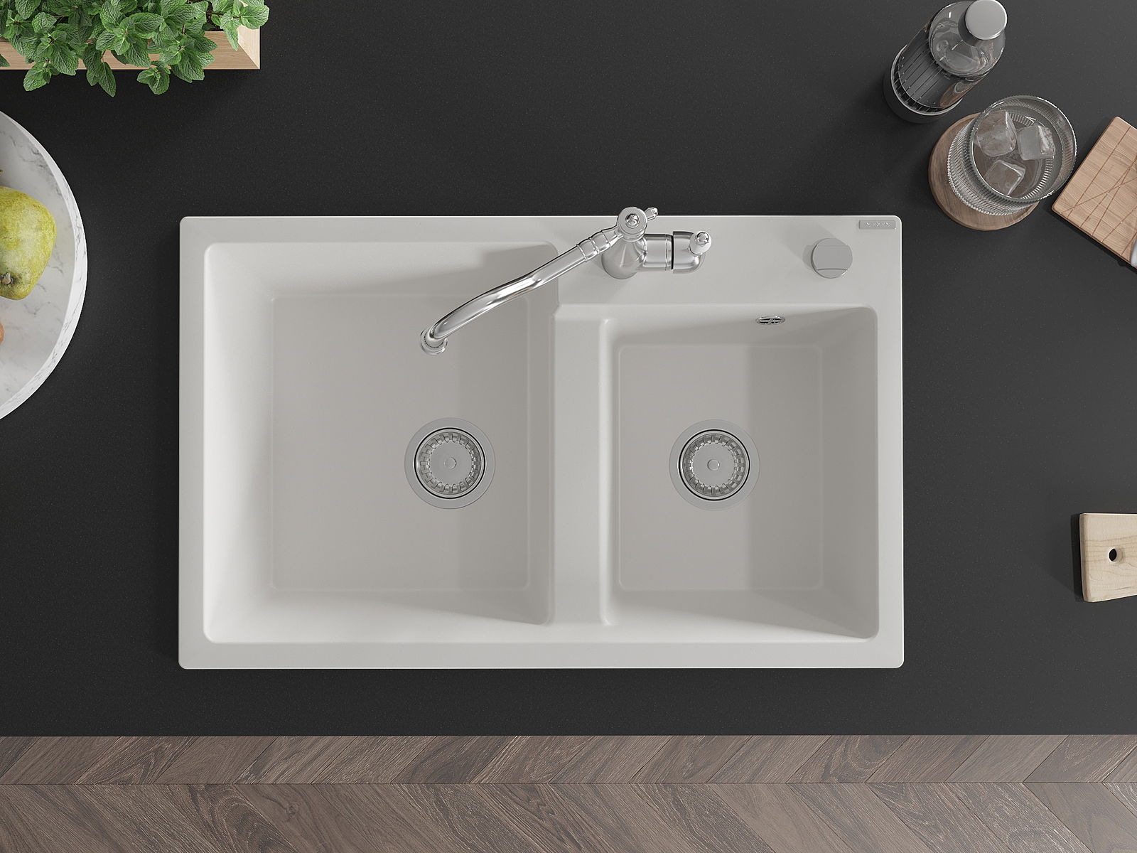 Mexen Tomas lavello in granito a 2 vasche con rubinetto da cucina Carla, bianco - 6516-20-670700-00