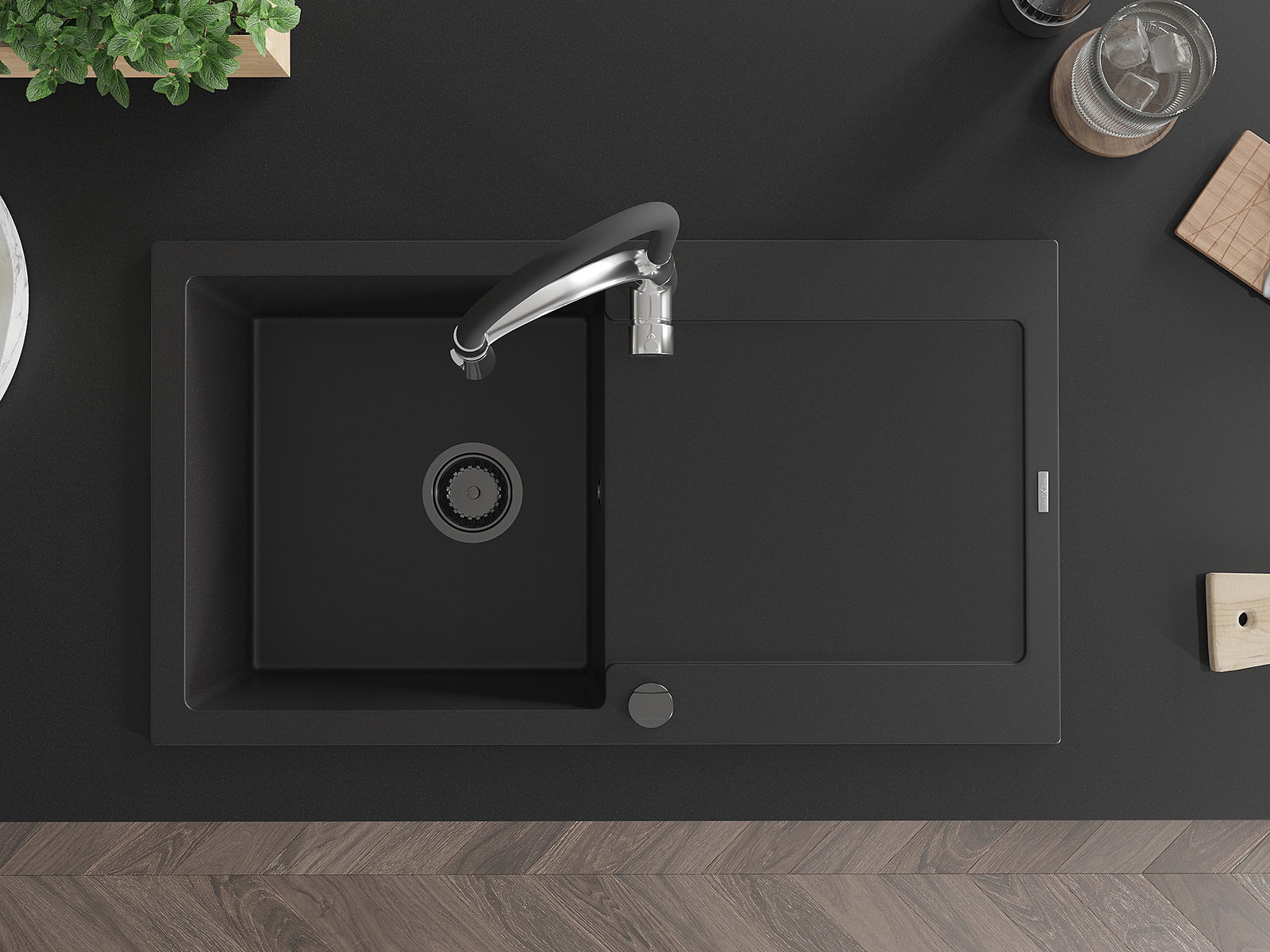 Mexen Leo lavello da cucina in granito a 1 vasca con gocciolatoio e rubinetto da cucina Aster, nero - 6501-77-73450-07-B