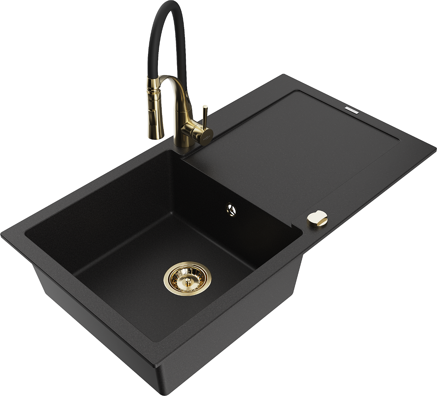 Mexen Leo lavello in granito a 1 vasca con scolapiatti e rubinetto da cucina Aster, nero - 6501-77-73450-57-G