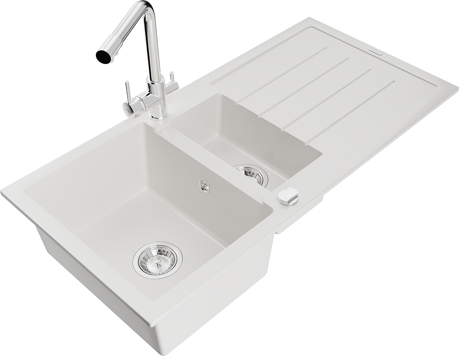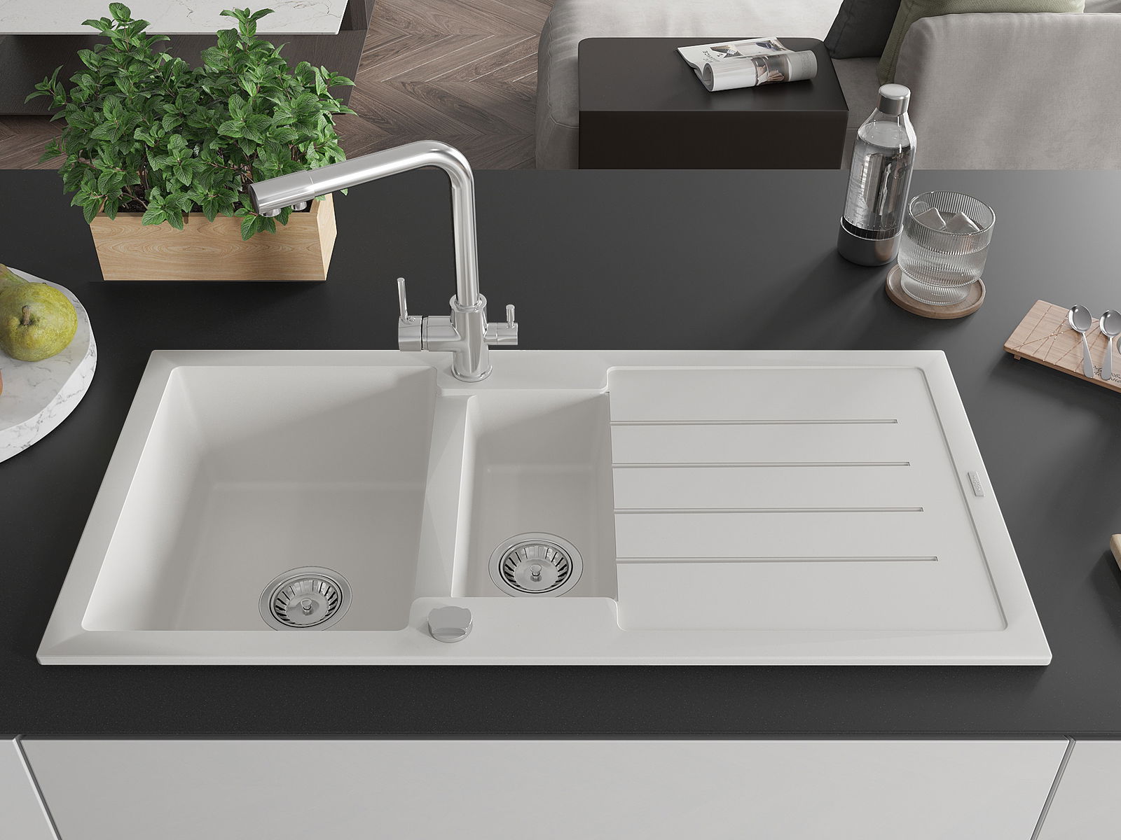 Mexen Andres lavello in granito 1,5 vasche con gocciolatoio e miscelatore da cucina Duero, bianco - 6515-20-671600-00