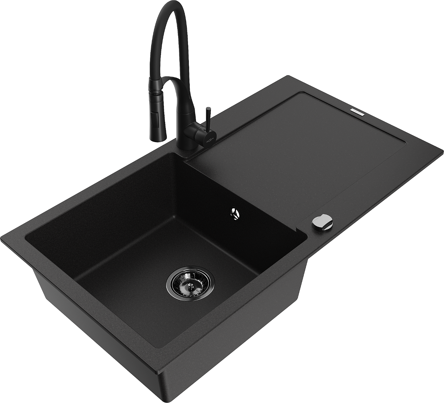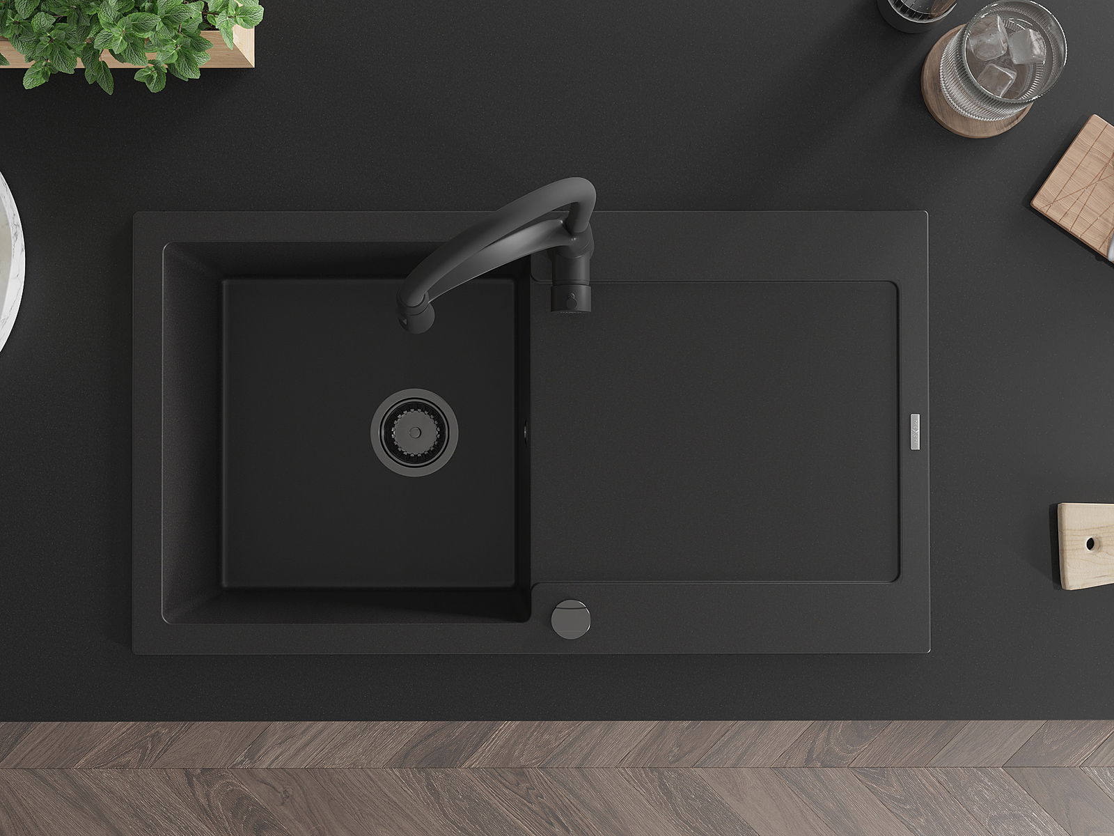 Mexen Leo lavello in granito 1-vasca con gocciolatoio e rubinetto da cucina Aster, nero - 6501-77-73450-70-B