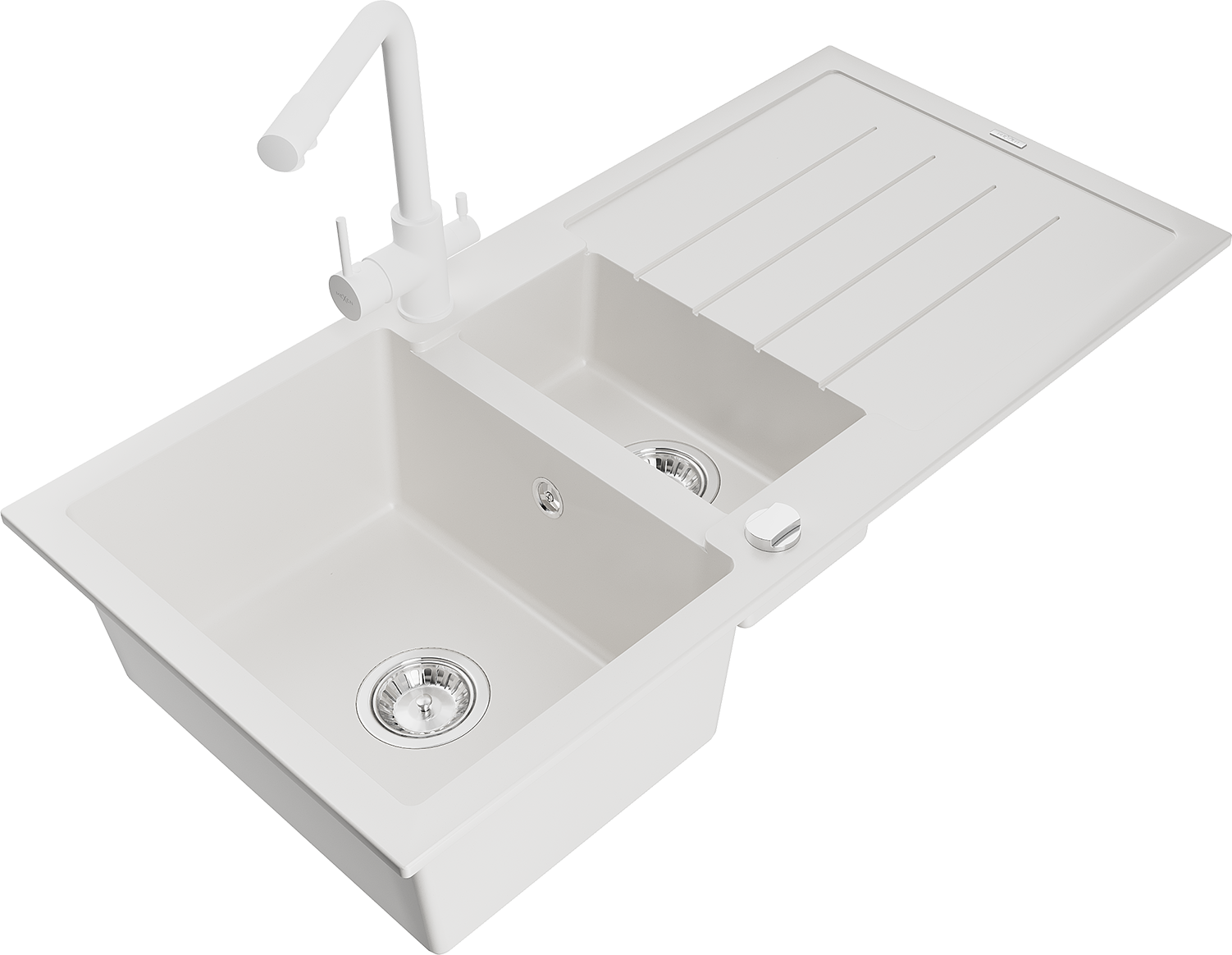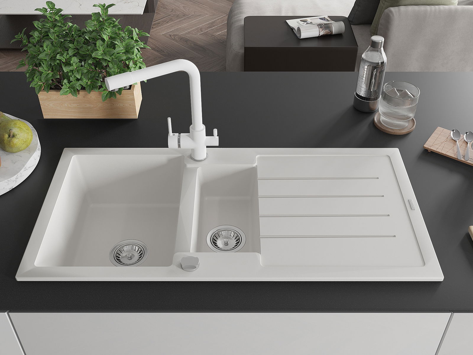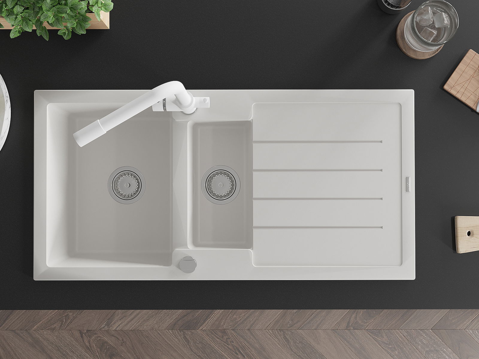 Mexen Andres lavello in granito a 1,5 vasche con gocciolatoio e rubinetto da cucina Duero, bianco - 6515-20-671600-20