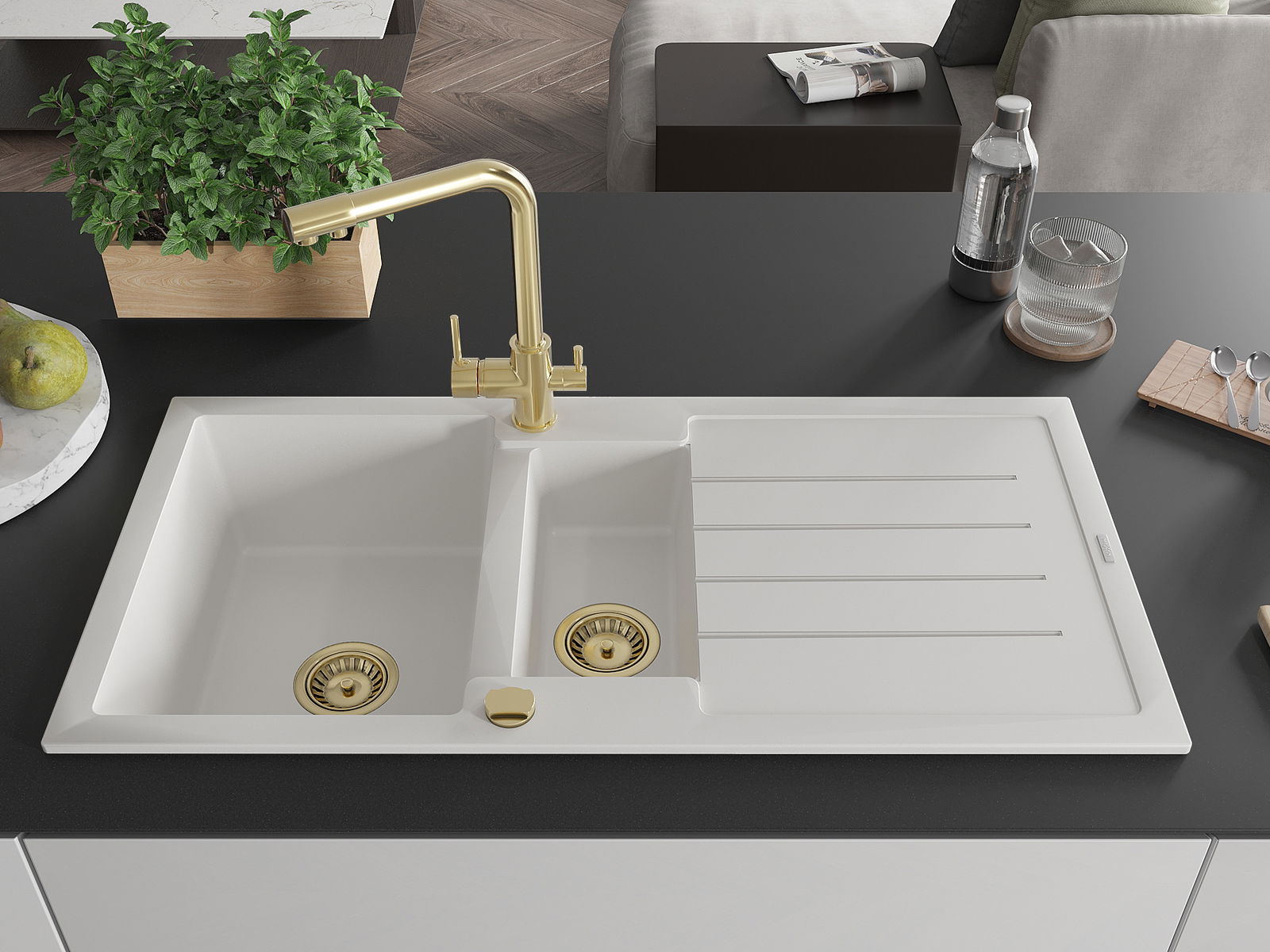 Mexen Andres lavello in granito 1,5 vasca con scolapiatti e rubinetto da cucina Duero, bianco - 6515-20-671600-50