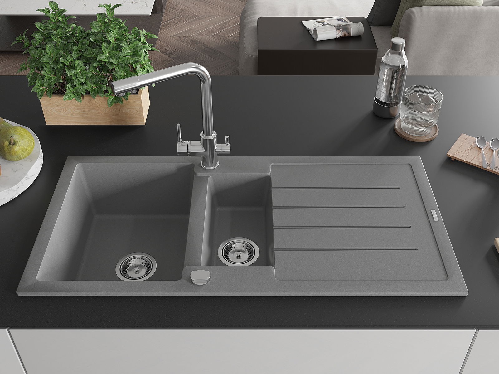 La scelta di un lavello con sgocciolatoio è una soluzione pratica che consente di riporre piatti, verdure e frutta lavati. Lo sgocciolatoio facilita la cucina quotidiana e aiuta a mantenere l'ordine in cucina.