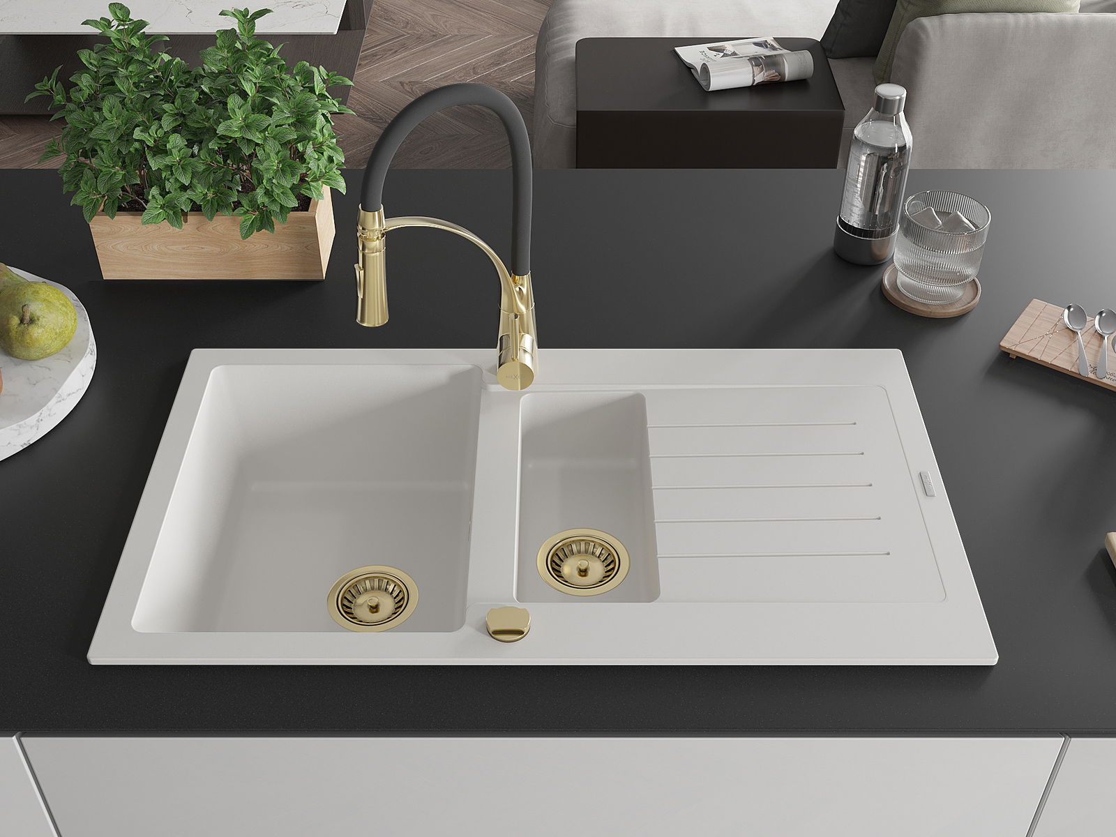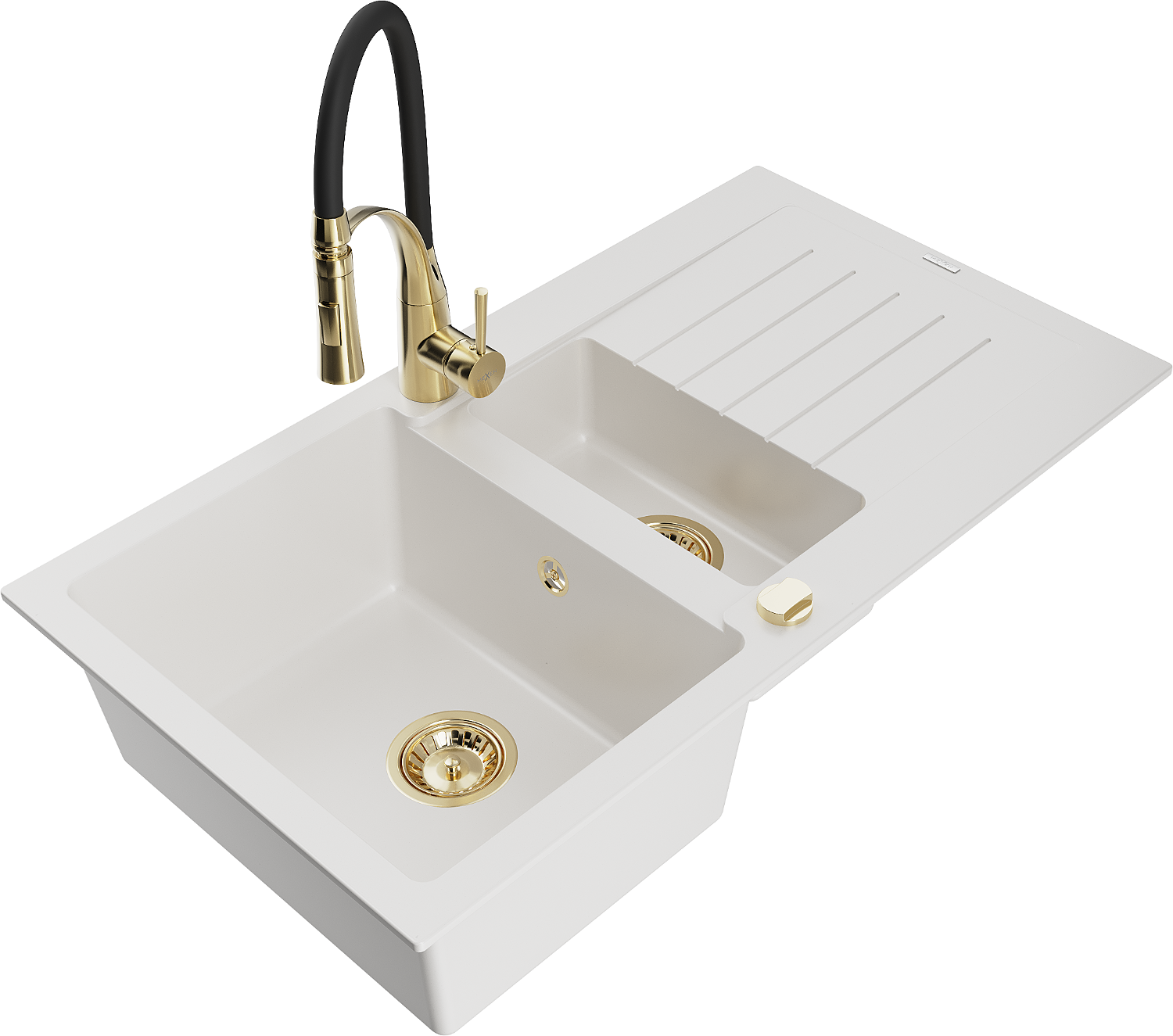 Mexen Matias lavello in granito 1,5 vasche con sgocciolatoio e rubinetto da cucina Aster, bianco - 6502-20-73450-57-G