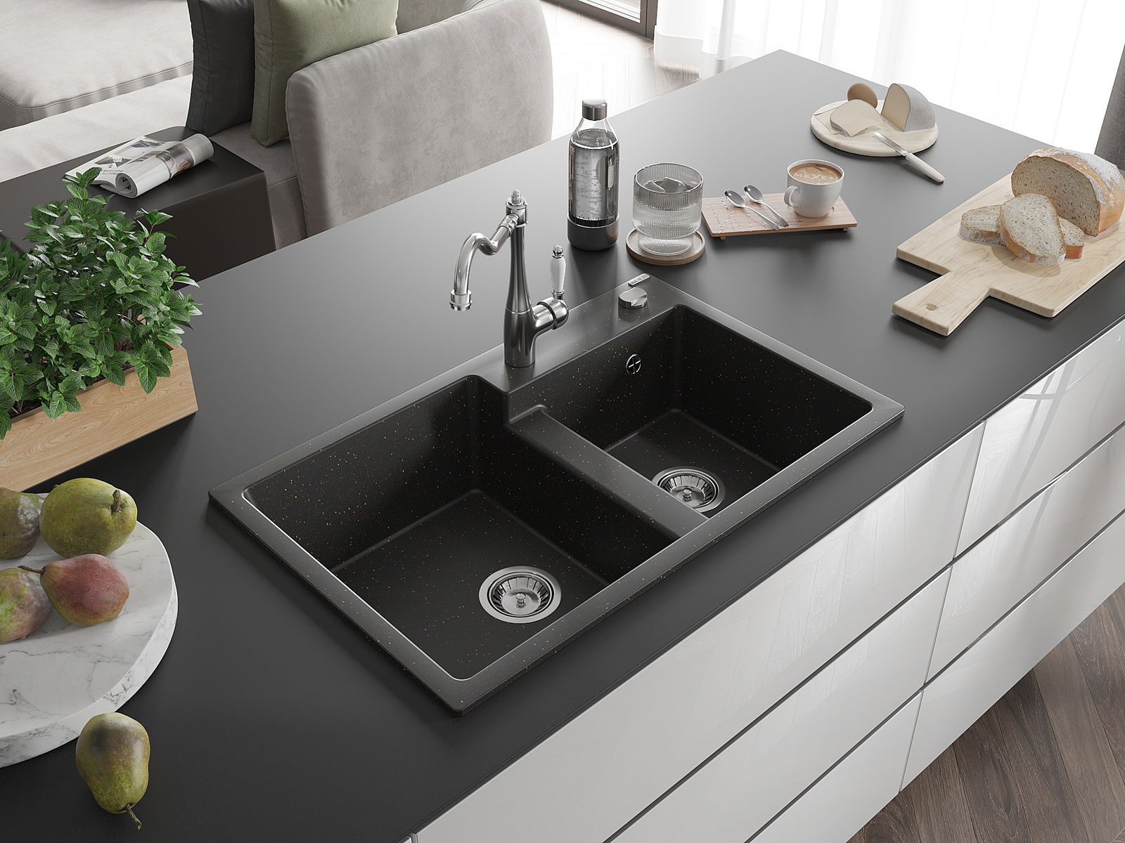 Il lavello è realizzato in granito di alta qualità. Rappresenta un complemento elegante e, soprattutto, pratico per ogni cucina, indipendentemente dal suo stile. L'alta qualità e la durata del granito garantiscono un utilizzo che dura per molti anni.