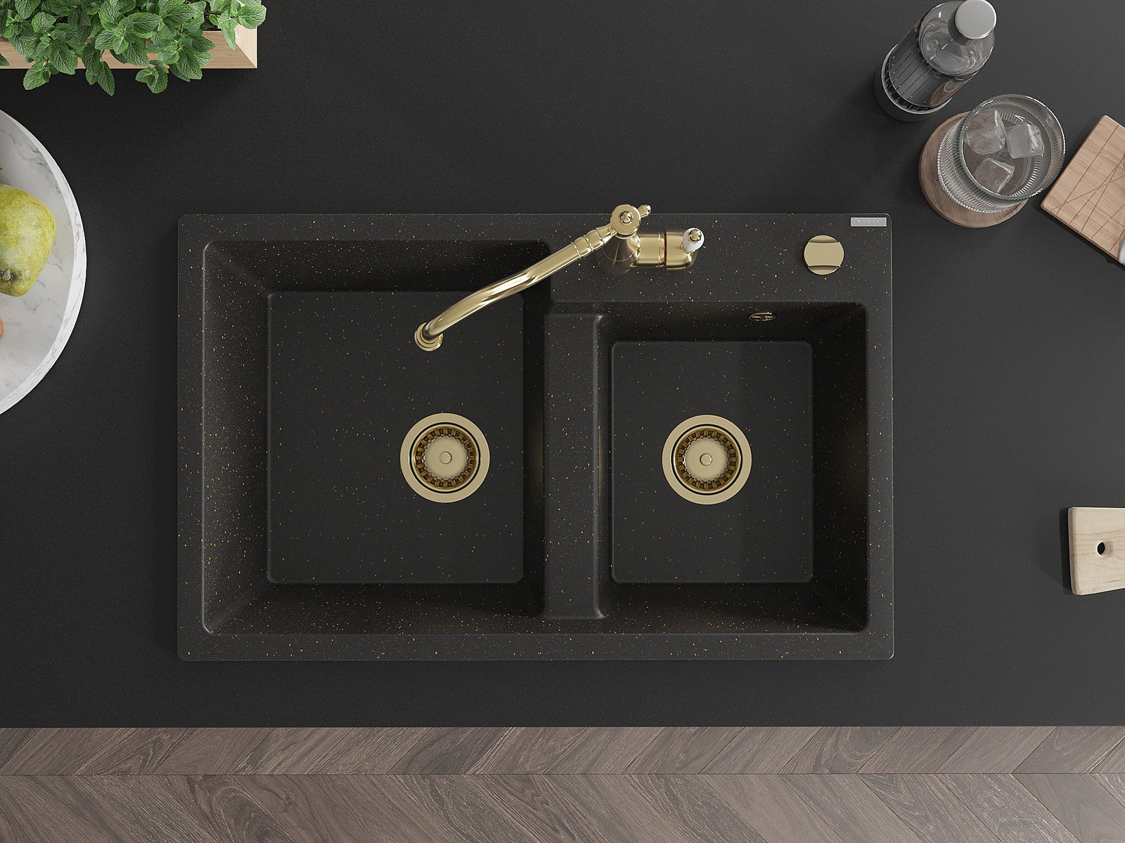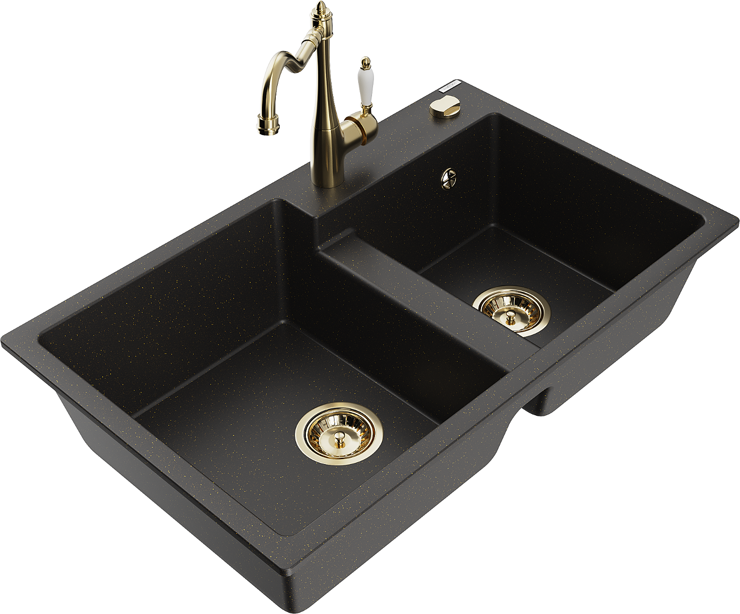 Mexen Tomas lavello da cucina in granito a 2 vasche con miscelatore da cucina Carla, nero/oro metallizzato - 6516-75-670700-50