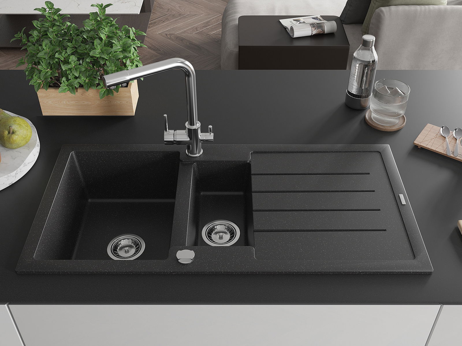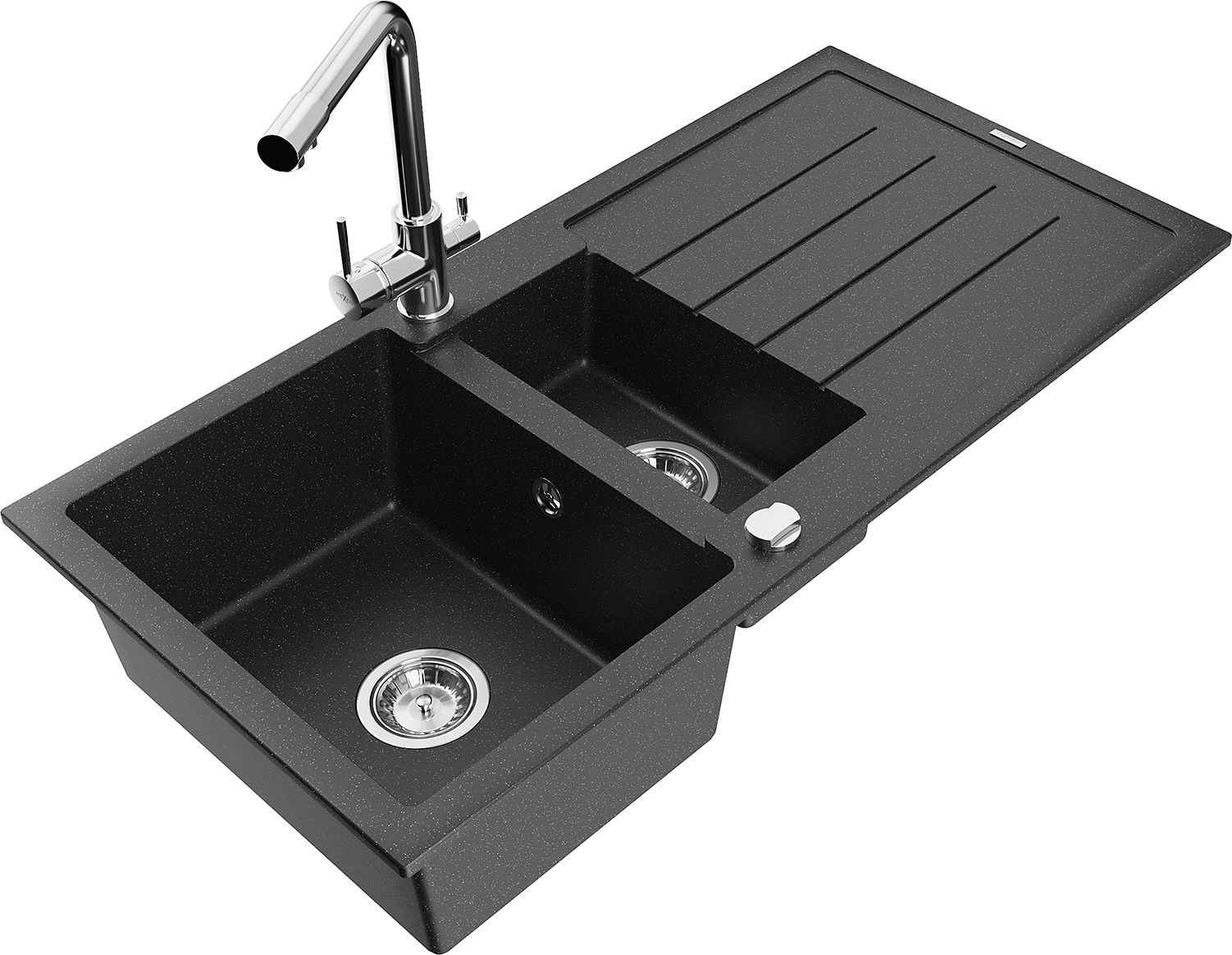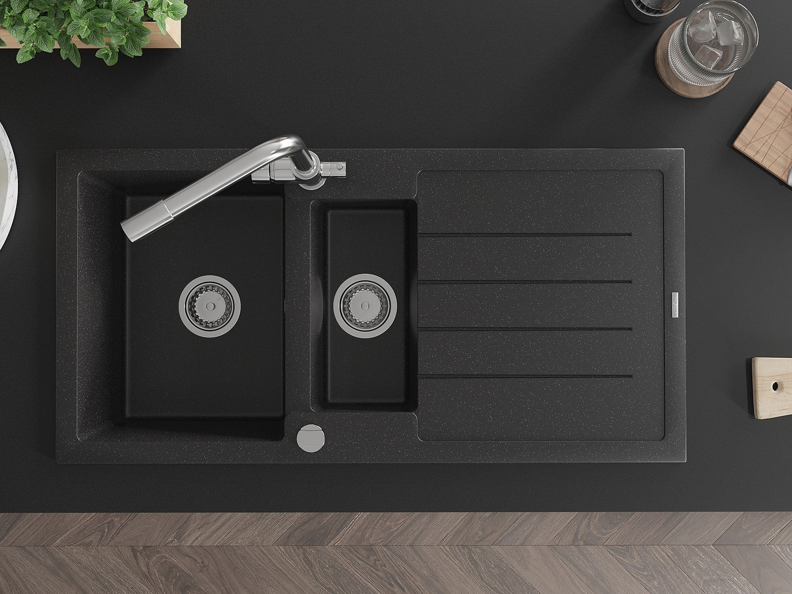 Mexen Andres lavello da cucina in granito 1,5 vasche con gocciolatoio e rubinetto Duero, nero/argento - 6515-73-671600-00