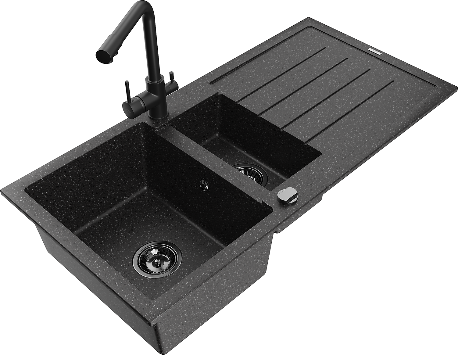 Mexen Andres lavello in granito 1,5 vasca con scolapiatti e rubinetto da cucina Duero, nero/argento - 6515-73-671600-70-B