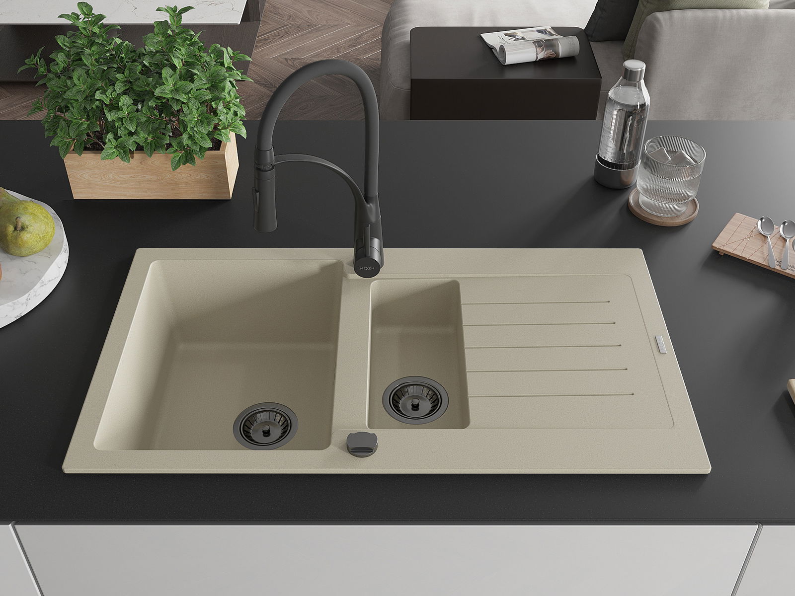 Mexen Matias lavello in granito 1,5 vasche con sgocciolatoio e rubinetto da cucina Aster, beige - 6502-69-73450-70-B