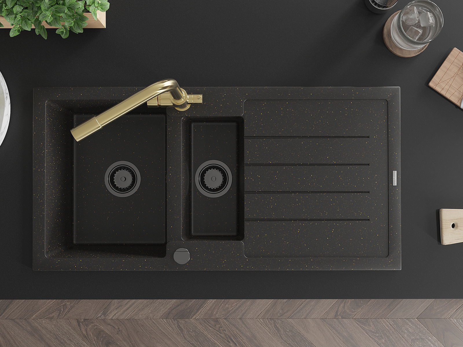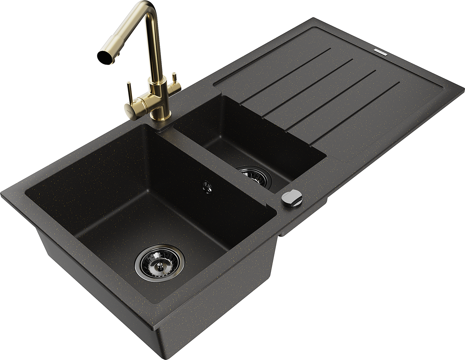 Mexen Andres lavello in granito 1,5 vasche con sgocciolatoio e rubinetto da cucina Duero, nero/oro - 6515-75-671600-50-B