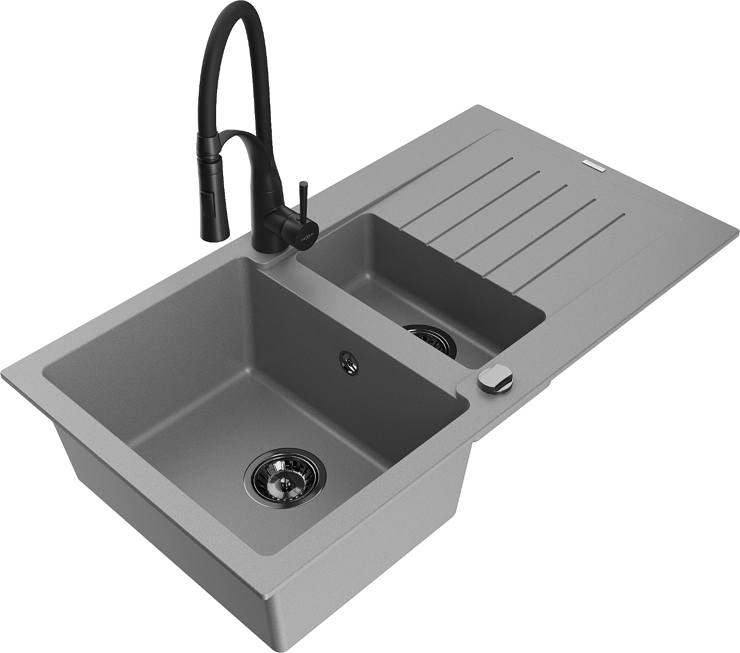 Mexen Matias lavello in granito 1,5 vasche con gocciolatoio e rubinetto da cucina Aster, grigio - 6502-71-73450-70-B