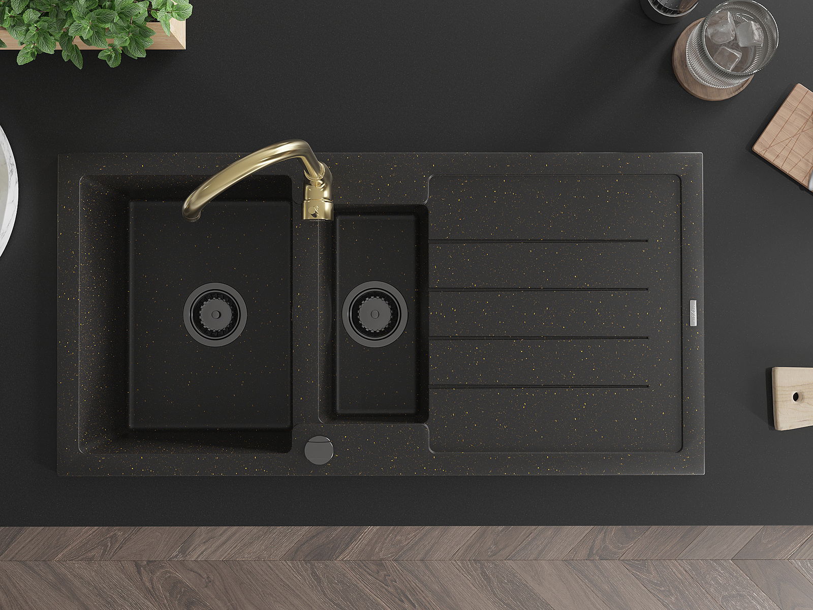 Mexen Andres lavello in granito a 1,5 vasca con scolapiatti e rubinetto da cucina Telma, nero/oro - 6515-75-670200-50-B