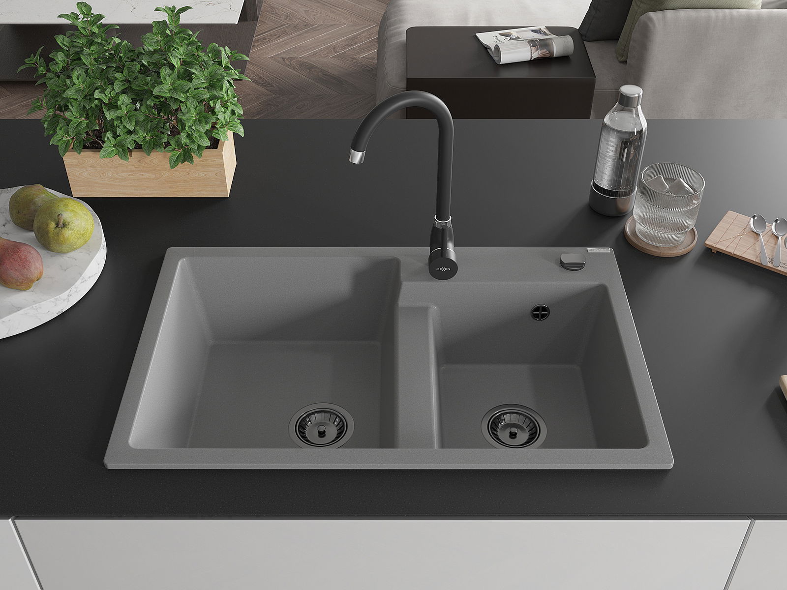 Mexen Tomas lavello da cucina in granito a 2 vasche con rubinetto Telma, grigio - 6516-71-670200-70-B