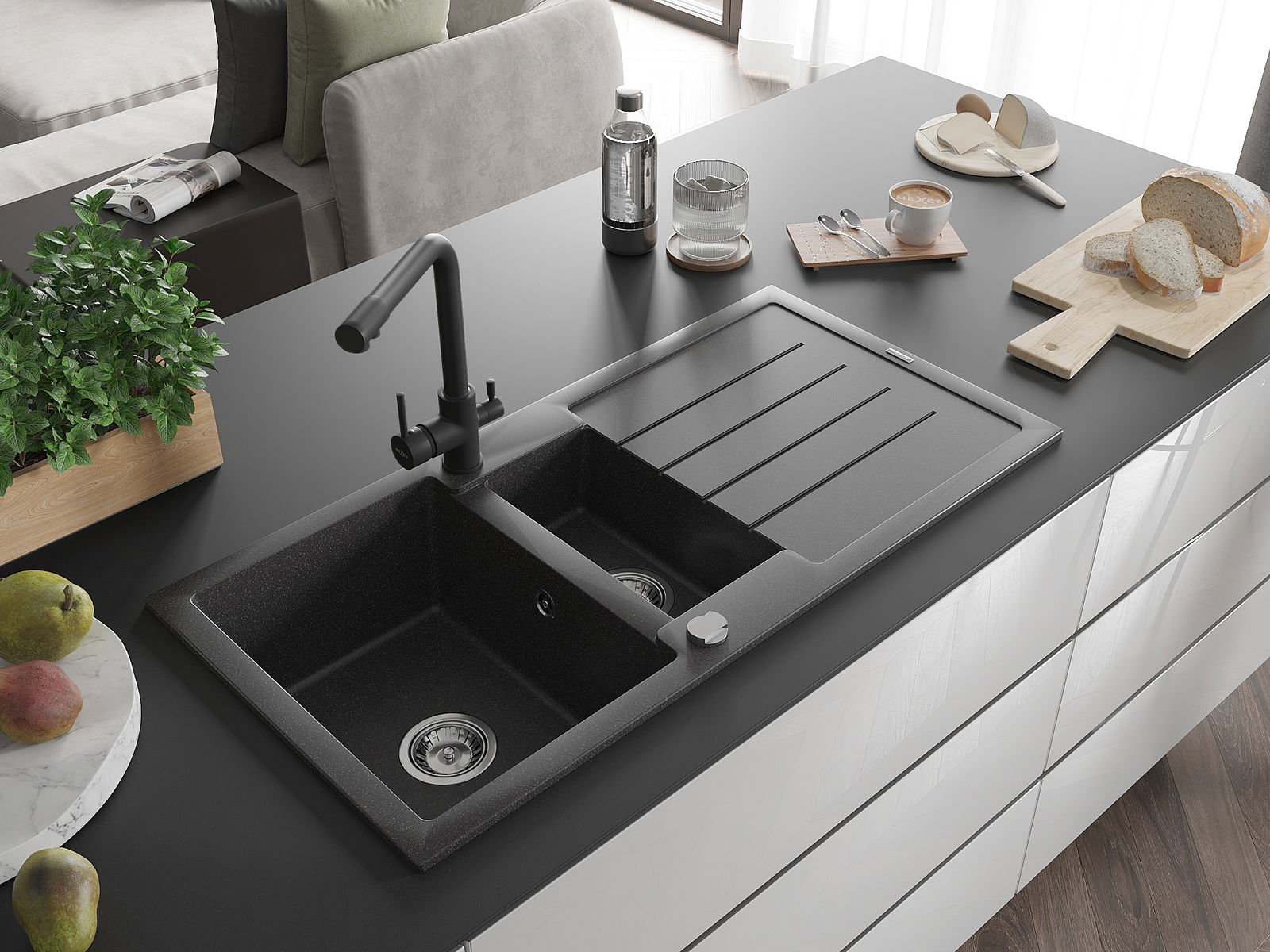 La scelta di un lavello con sgocciolatoio è una soluzione pratica che consente di riporre piatti, verdure e frutta lavati. Lo sgocciolatoio facilita la cucina quotidiana e aiuta a mantenere l'ordine in cucina.