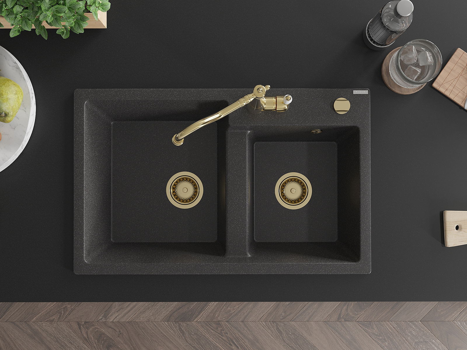 Mexen Tomas lavello da cucina in granito a 2 vasche con rubinetto Carla, nero maculato - 6516-76-670700-50