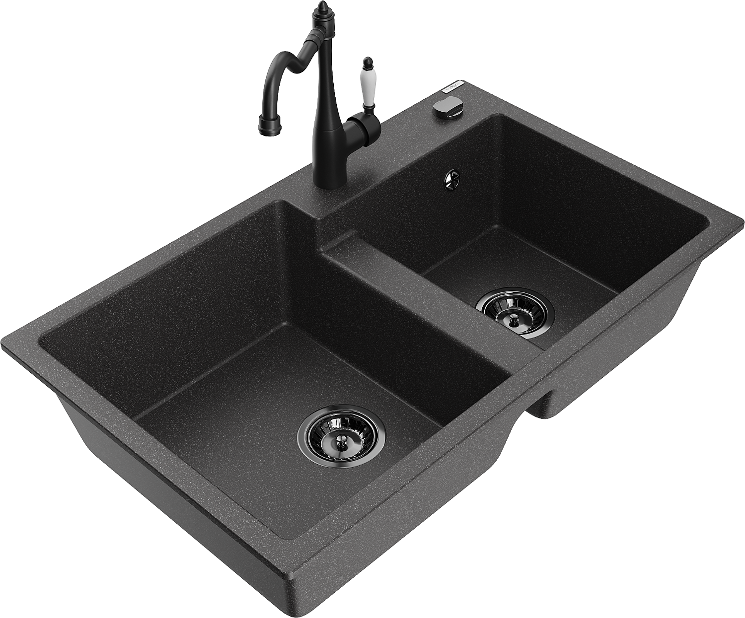 Mexen Tomas lavello da cucina in granito a 2 vasche con miscelatore monocomando Carla, nero maculato - 6516-76-670700-70-B