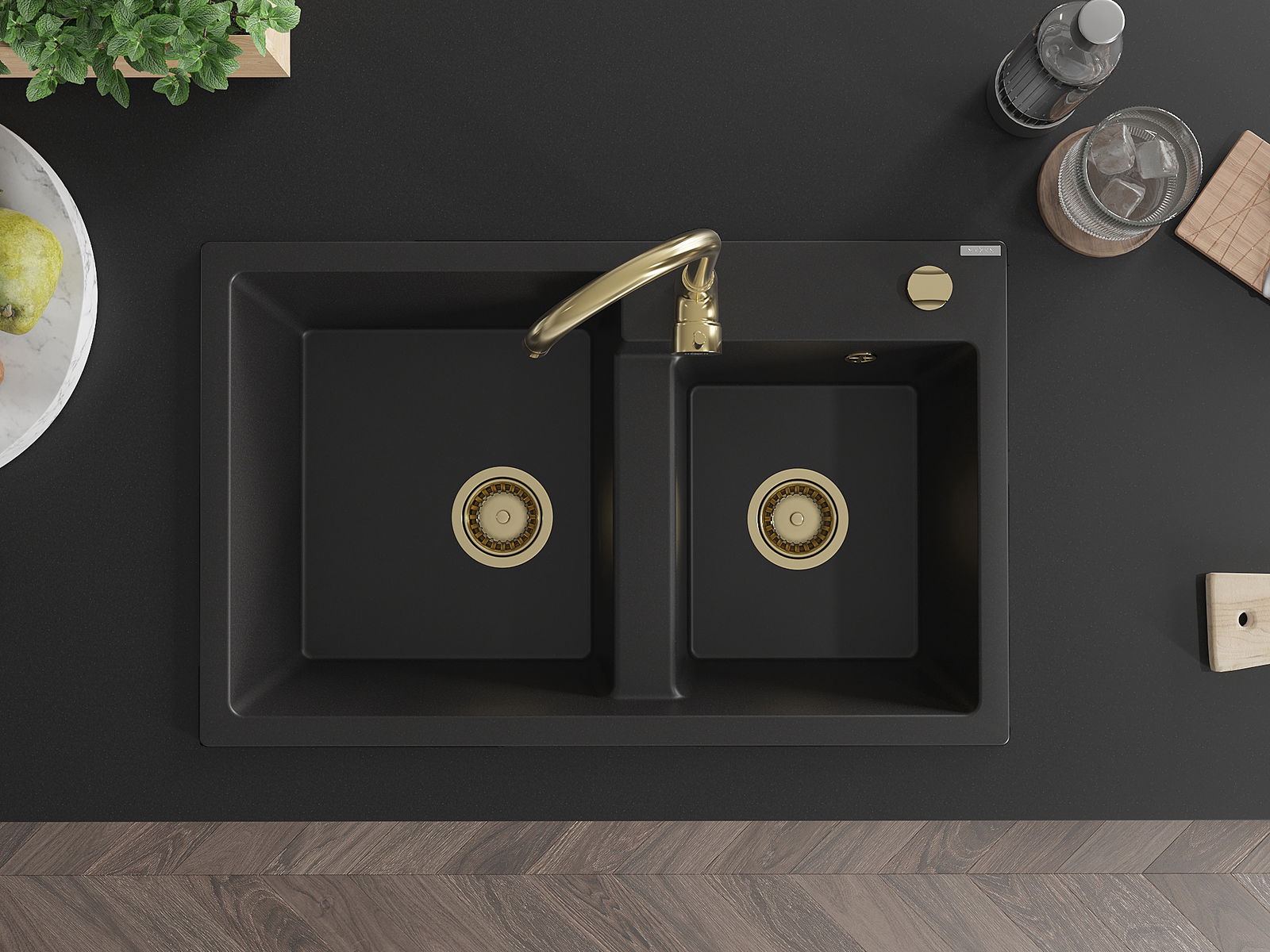 Il lavello ha un foro fresato di 35 mm di diametro da sfondare autonomamente. Può essere utilizzato, tra l'altro, per montare un dosatore di liquidi, che eliminerà la presenza di bottiglie di plastica in cucina e conferirà un tocco di eleganza.