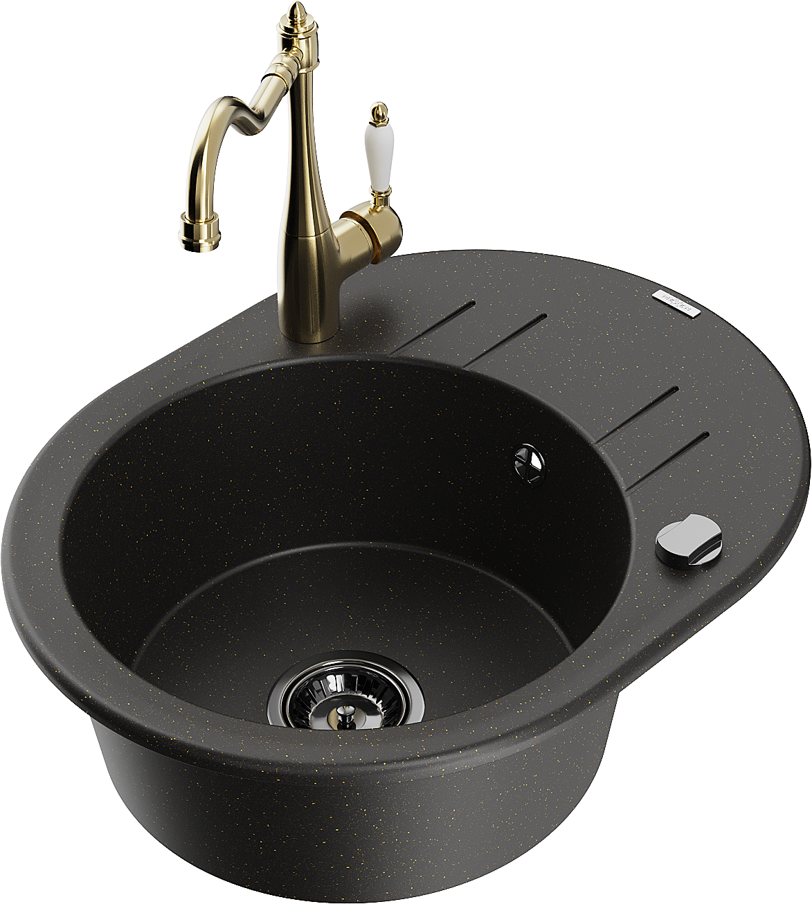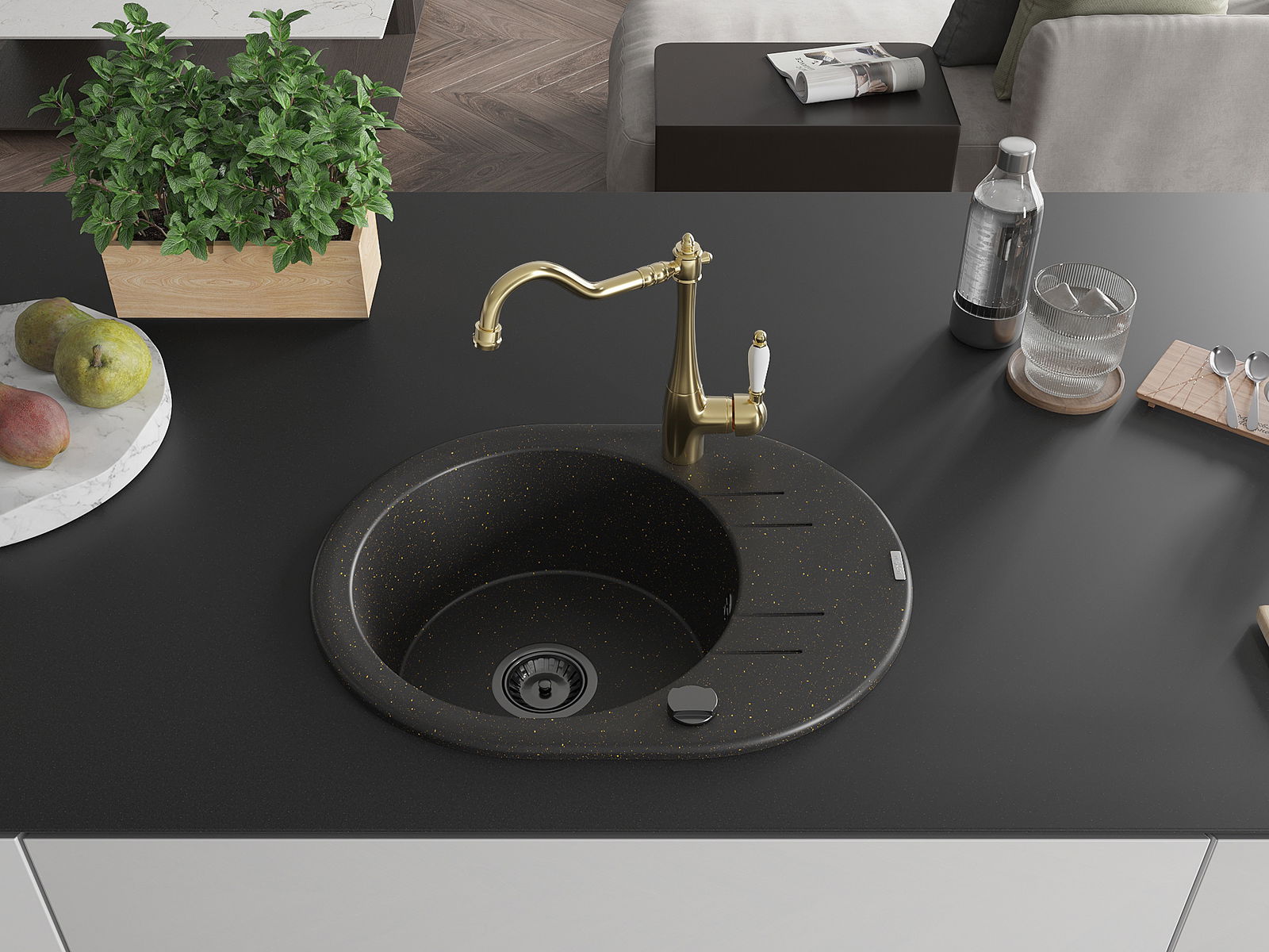 Mexen Kevin lavello in granito a 1 vasca con sgocciolatoio e rubinetto da cucina Carla, nero/oro metallico - 6517-75-670700-50-B