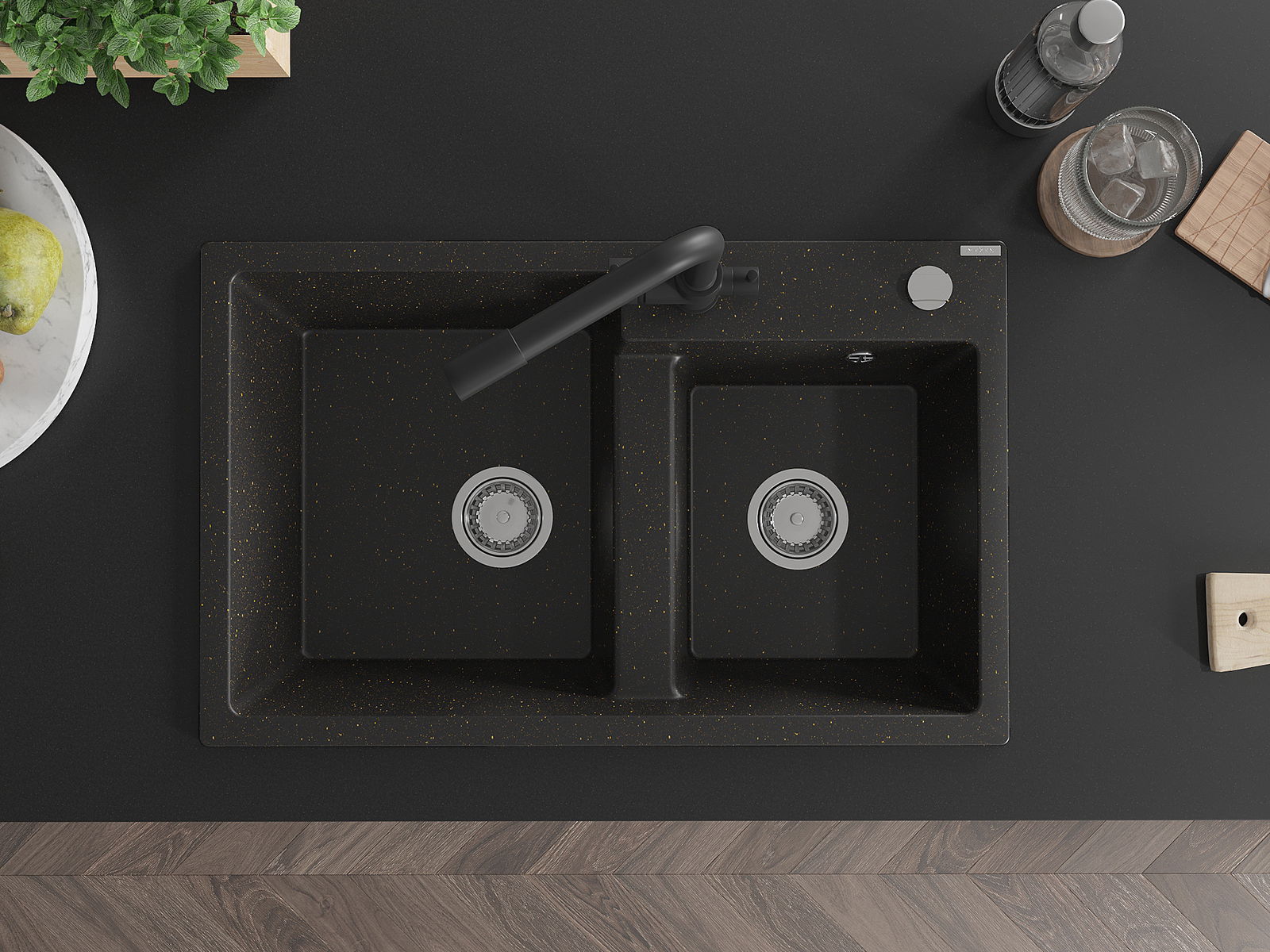 Mexen Tomas lavello da cucina in granito a 2 vasche con miscelatore Duero, nero/metallo dorato - 6516-75-671600-70