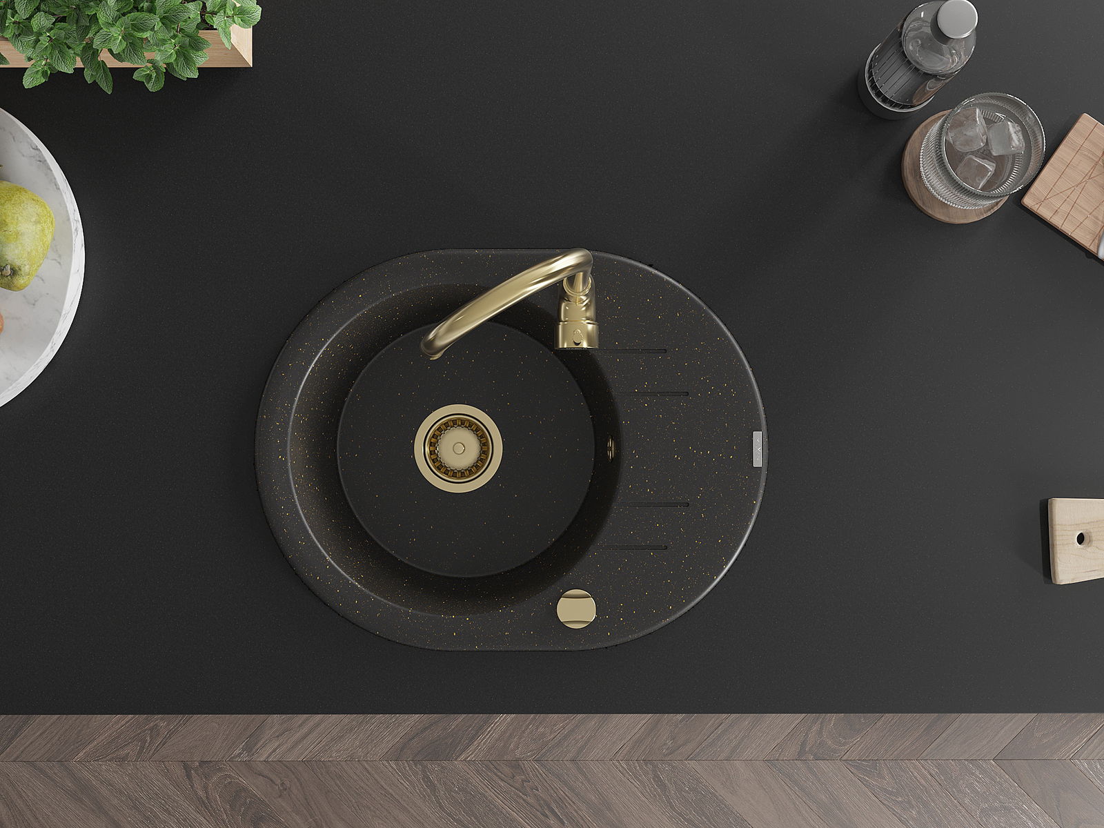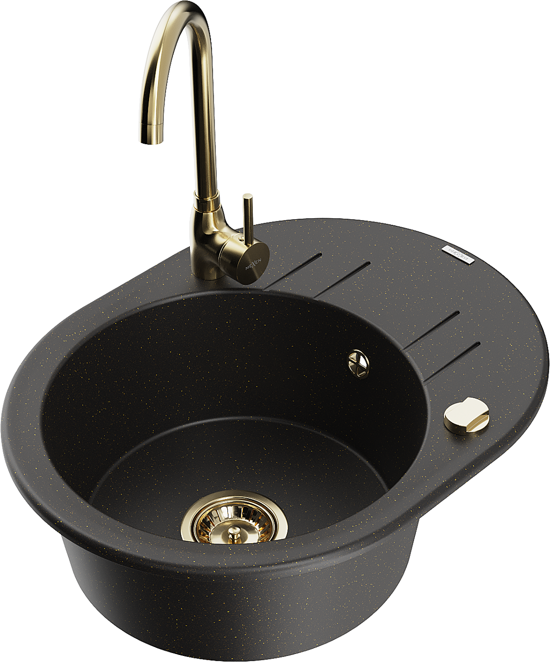 Mexen Kevin lavello in granito a 1 vasca con scolapiatti e rubinetto da cucina Telma, nero/oro metallizzato - 6517-75-670200-50