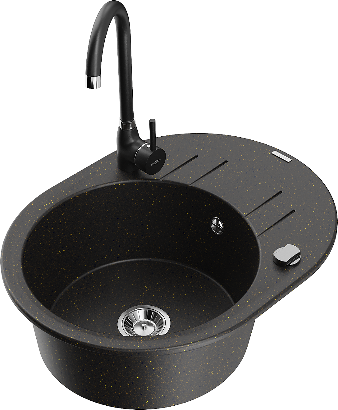 Mexen Kevin lavello in granito a 1 vasca con sgocciolatoio e rubinetto da cucina Telma, nero/oro metallico - 6517-75-670200-70