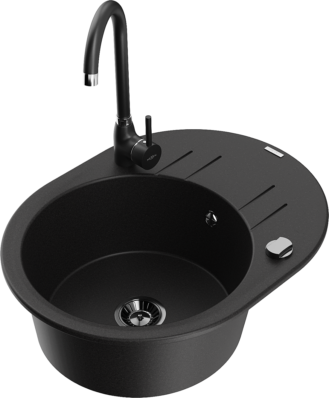 Mexen Kevin lavello da cucina in granito con 1 vasca e gocciolatoio e rubinetto Telma, nero - 6517-77-670200-70-B