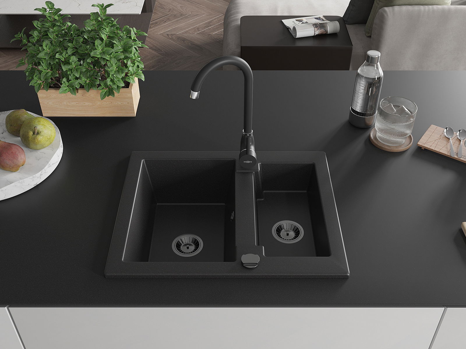 Mexen Carlos lavello in granito 1,5 vasche con rubinetto cucina Telma, nero - 6518-77-670200-70-B