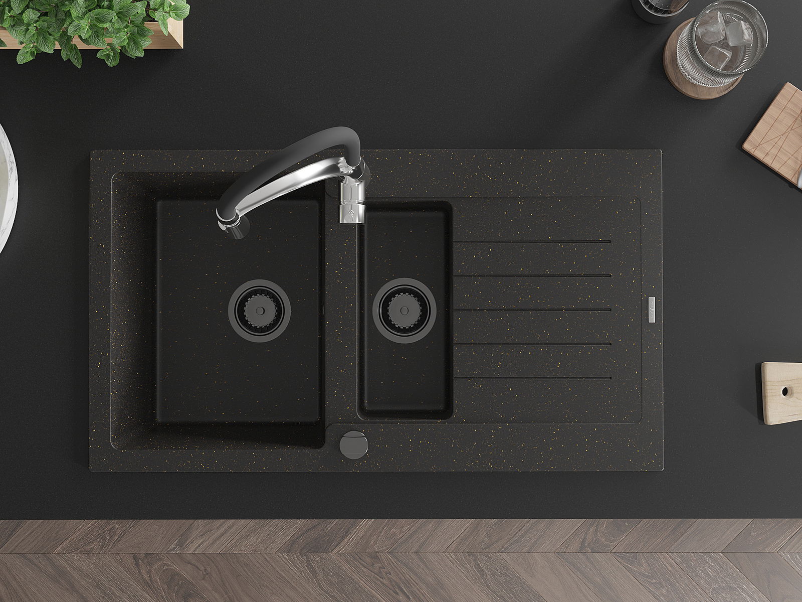 Mexen Matias lavello in granito 1,5 vasca con scolapiatti e rubinetto da cucina Aster, nero/oro metallizzato