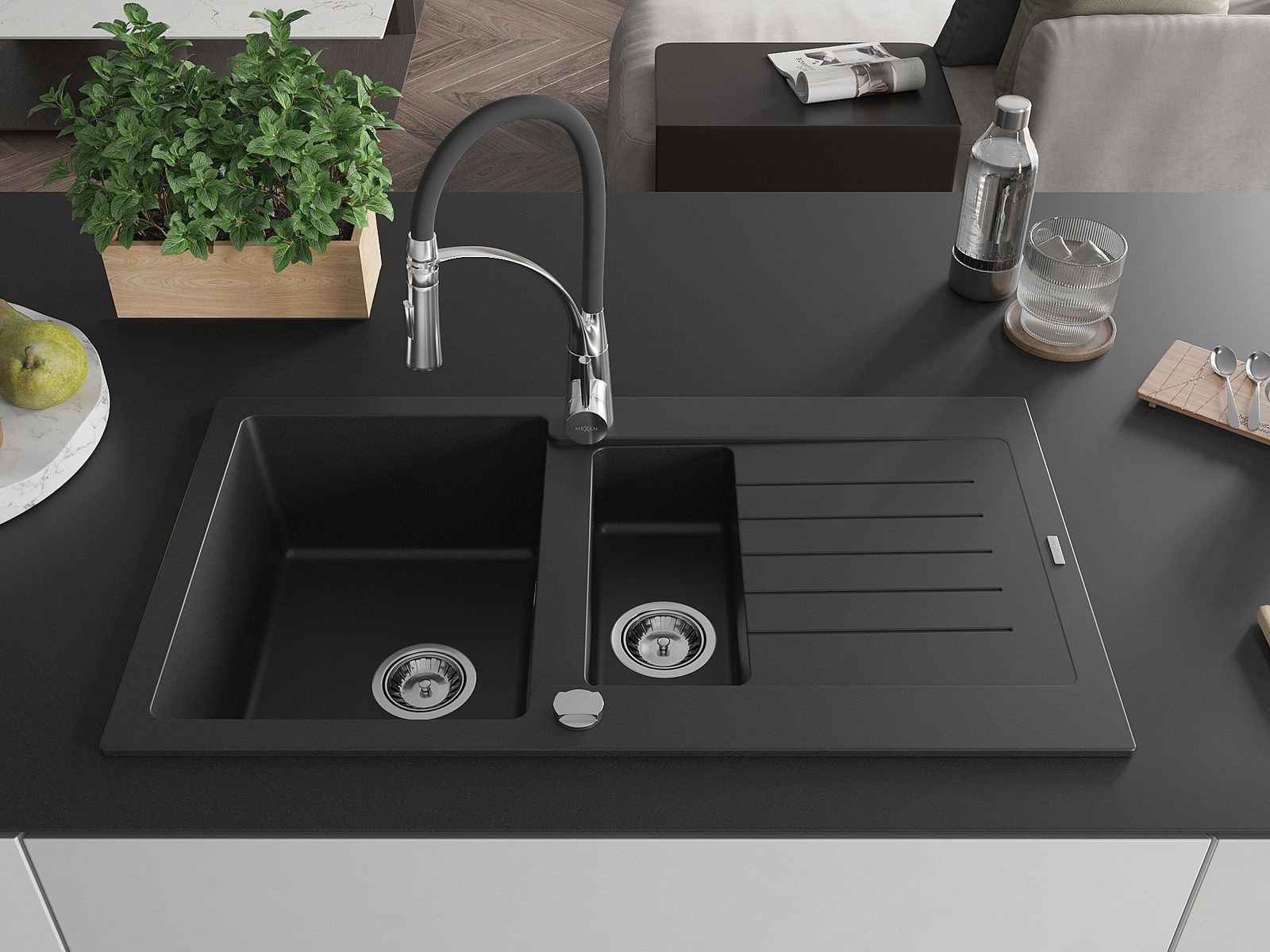 Mexen Matias lavello in granito 1,5 vasche con scolapiatti e rubinetto cucina Aster, nero - 6502-77-73450-07