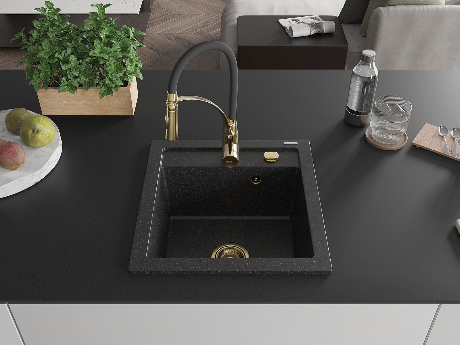 Mexen Vito lavello in granito 1-vasca con rubinetto da cucina Aster, nero/metallo argento - 6503-73-73450-57-G