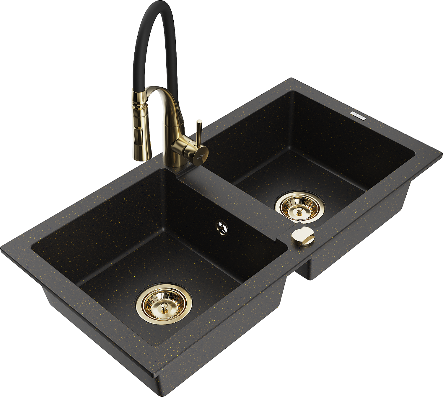 Mexen Mario lavello da cucina in granito a 2 vasche con rubinetto da cucina Aster, nero/oro metallico - 6504-75-73450-57-G