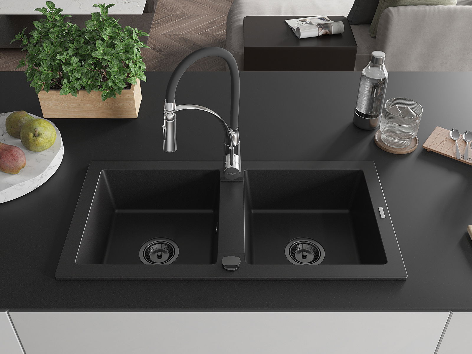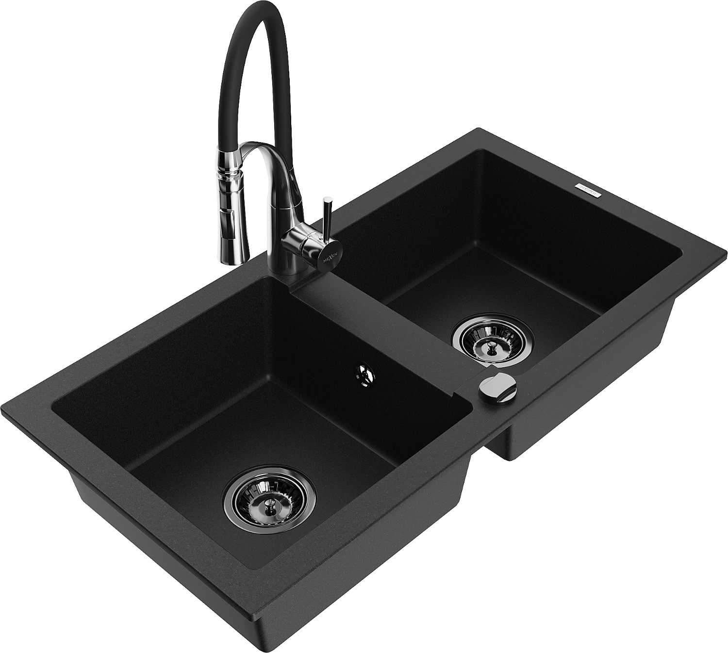 Mexen Mario lavello in granito a 2 vasche con rubinetto da cucina Aster, nero - 6504-77-73450-07-B