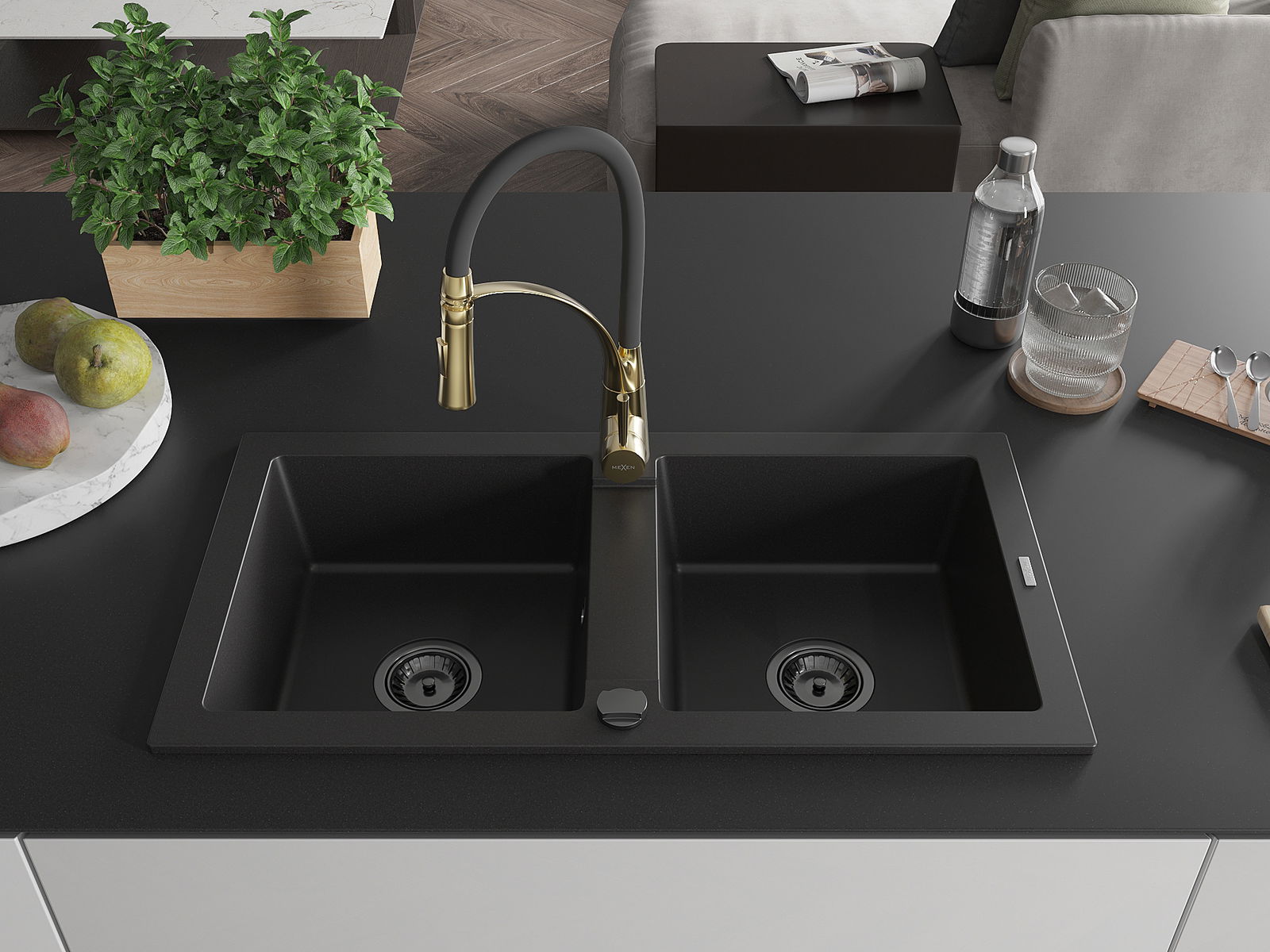 Mexen Mario lavello da cucina in granito a 2 vani con rubinetto Aster, nero - 6504-77-73450-57-B