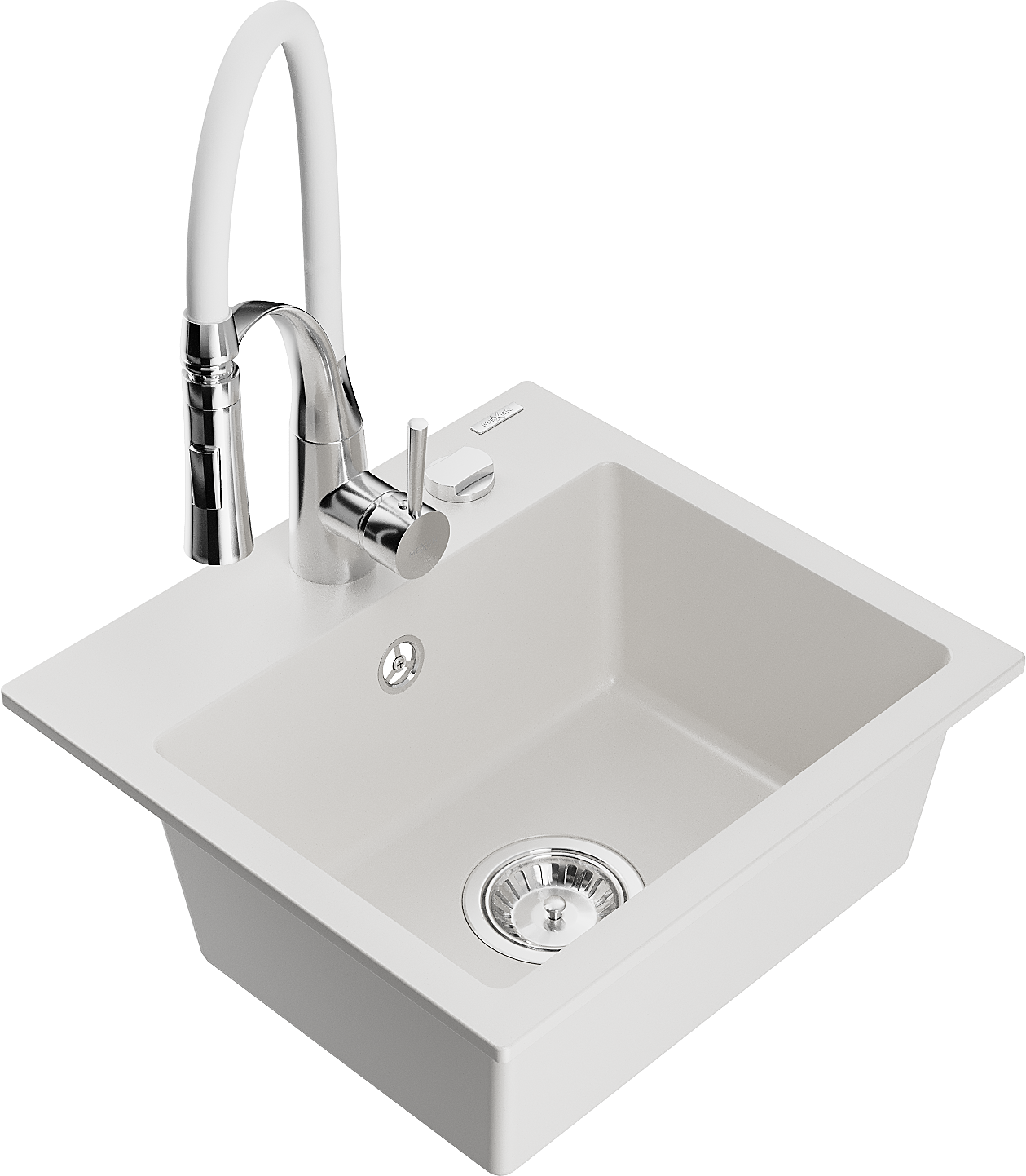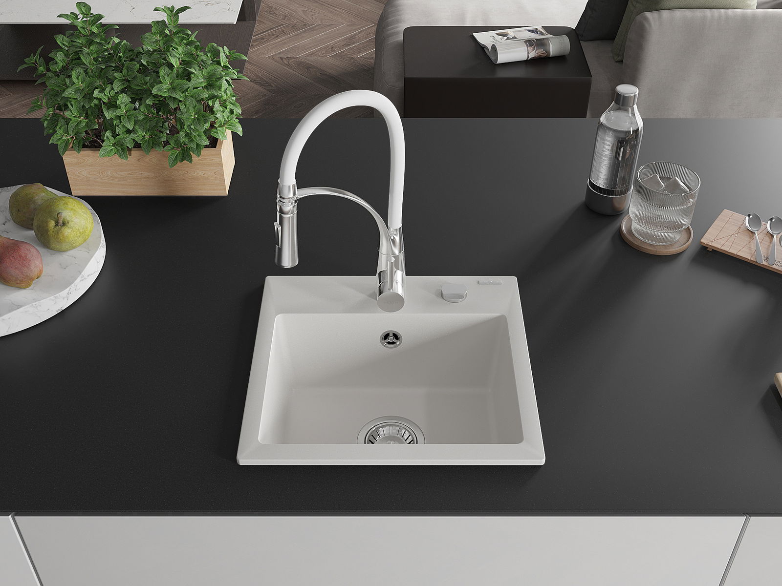 Mexen Milo lavello da cucina in granito a 1 vasca con rubinetto Aster, bianco - 6505-20-73450-02