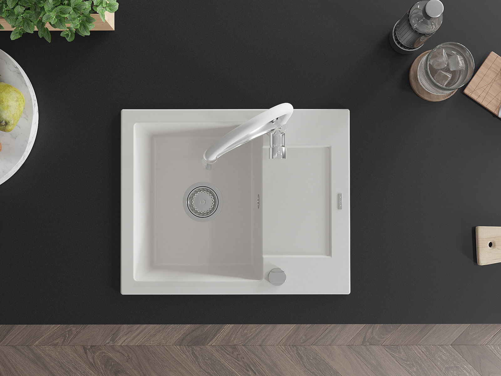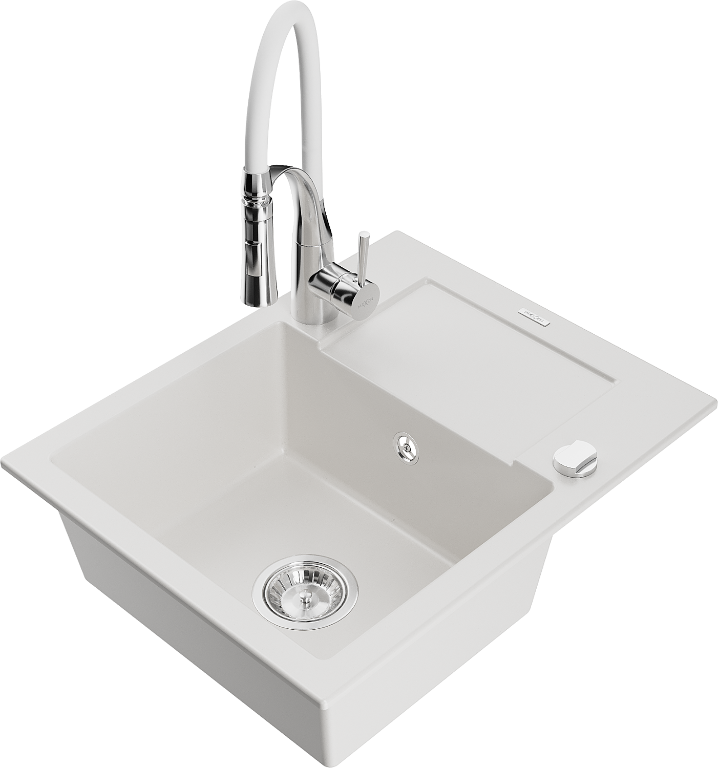Mexen Enzo lavello da cucina in granito con 1 vasca e gocciolatoio e rubinetto da cucina Aster, bianco - 6506-20-73450-02