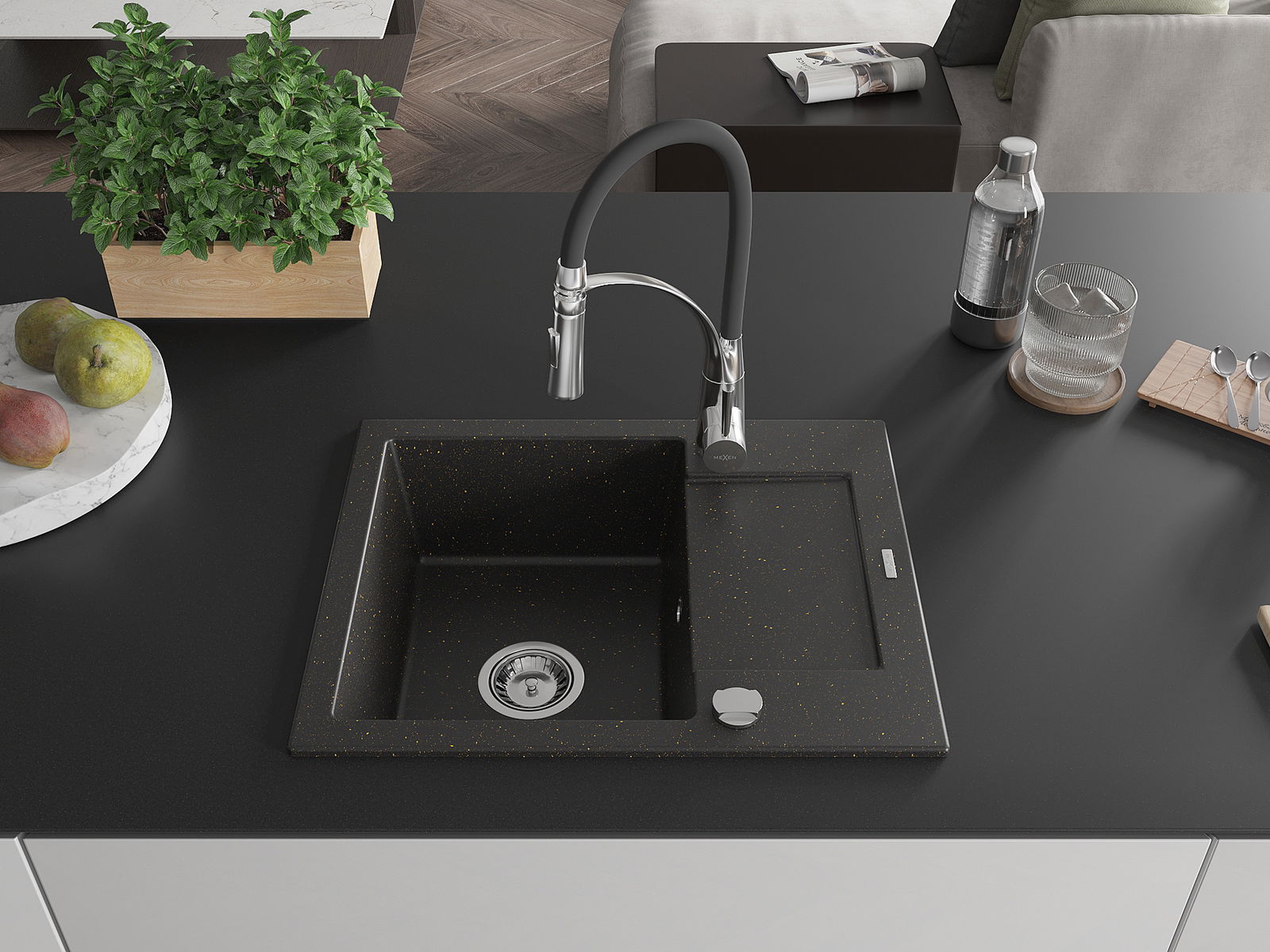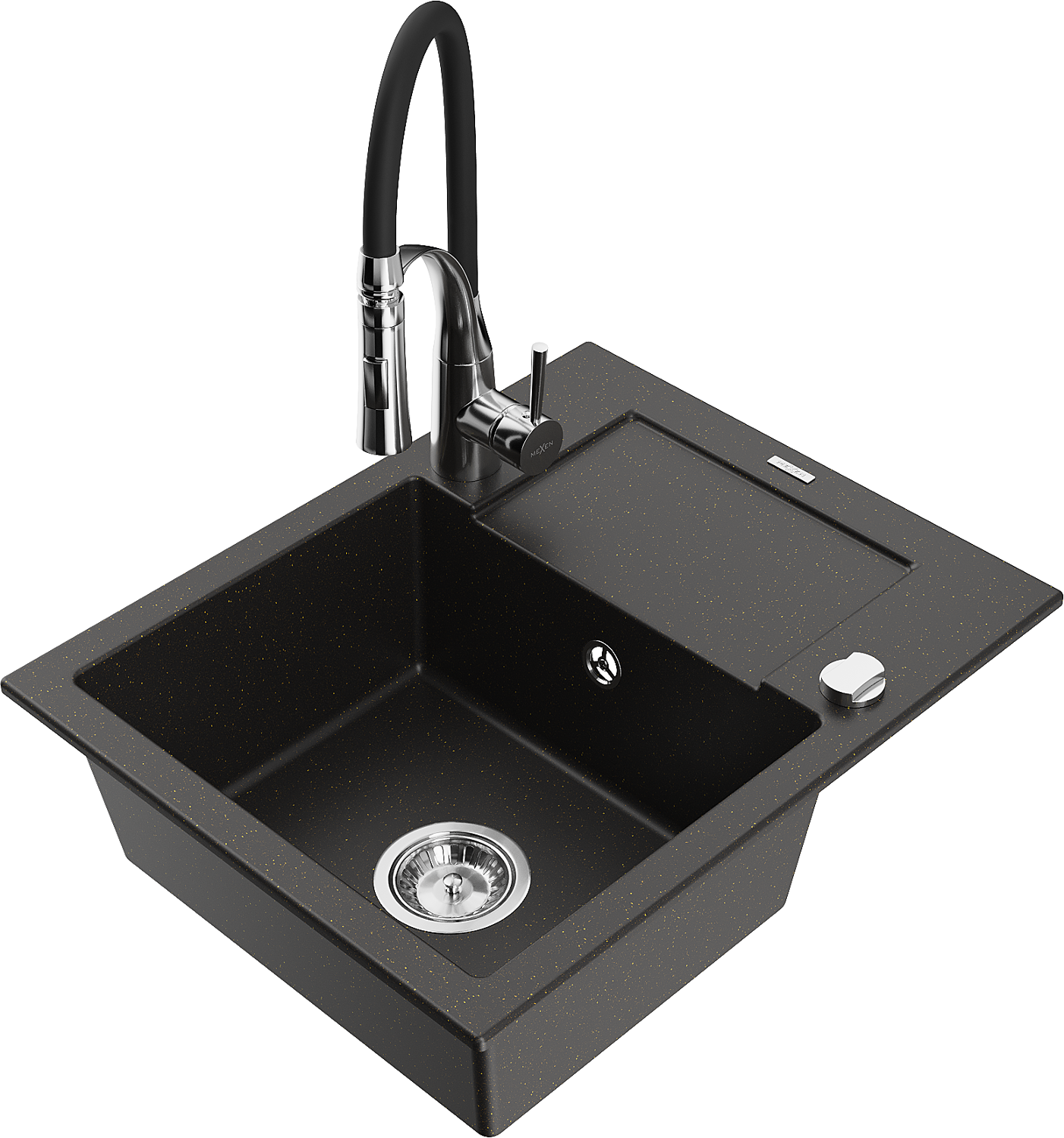 Mexen Enzo lavello in granito a 1 vasca con sgocciolatoio e miscelatore da cucina Aster, nero/oro metallico - 6506-75-73450-07
