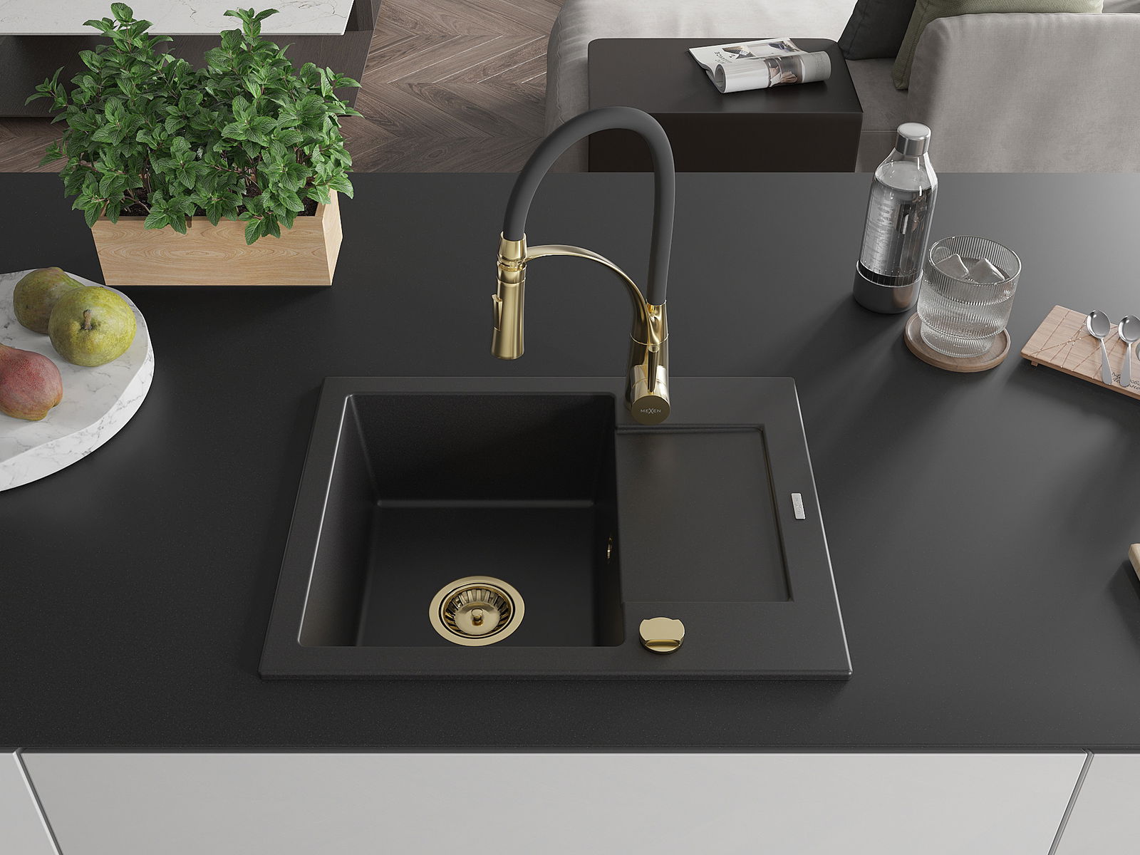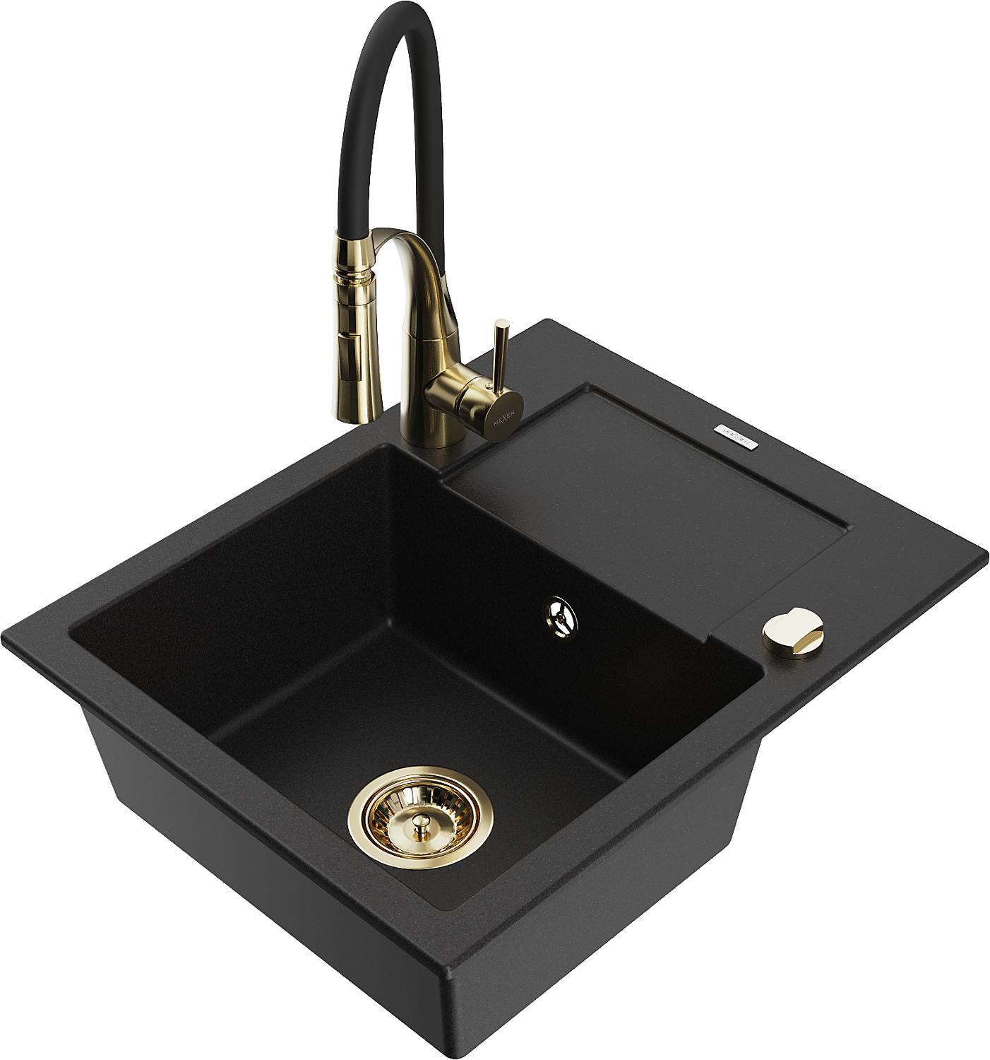 Mexen Enzo lavandino in granito a 1 vasca con scolapiatti e rubinetto da cucina Aster, nero - 6506-77-73450-57-G