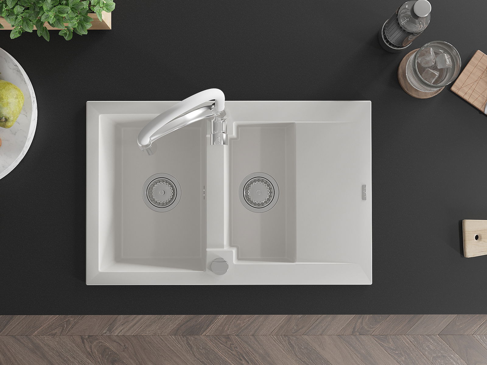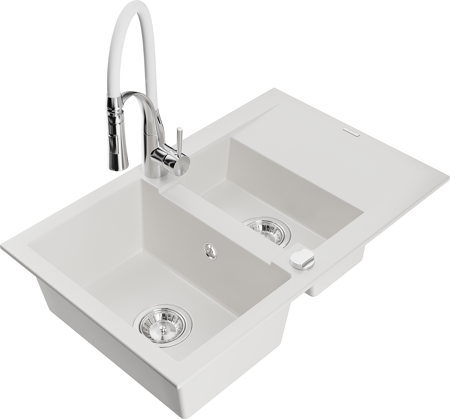 Mexen Gaspar lavello in granito 1,5 vasca con scolapiatti e rubinetto da cucina Aster, bianco - 6507-20-73450-02