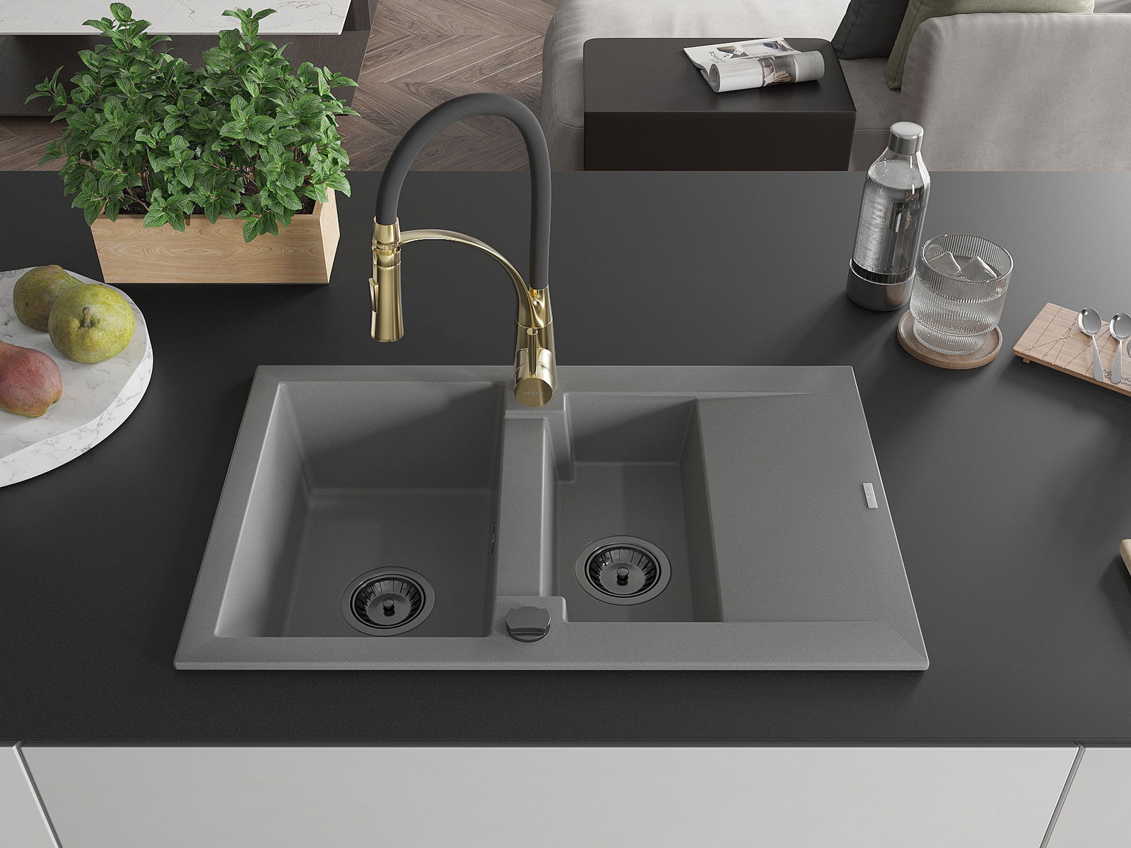 Mexen Gaspar lavello in granito 1,5 vasche con sgocciolatoio e rubinetto da cucina Aster, grigio - 6507-71-73450-57-B