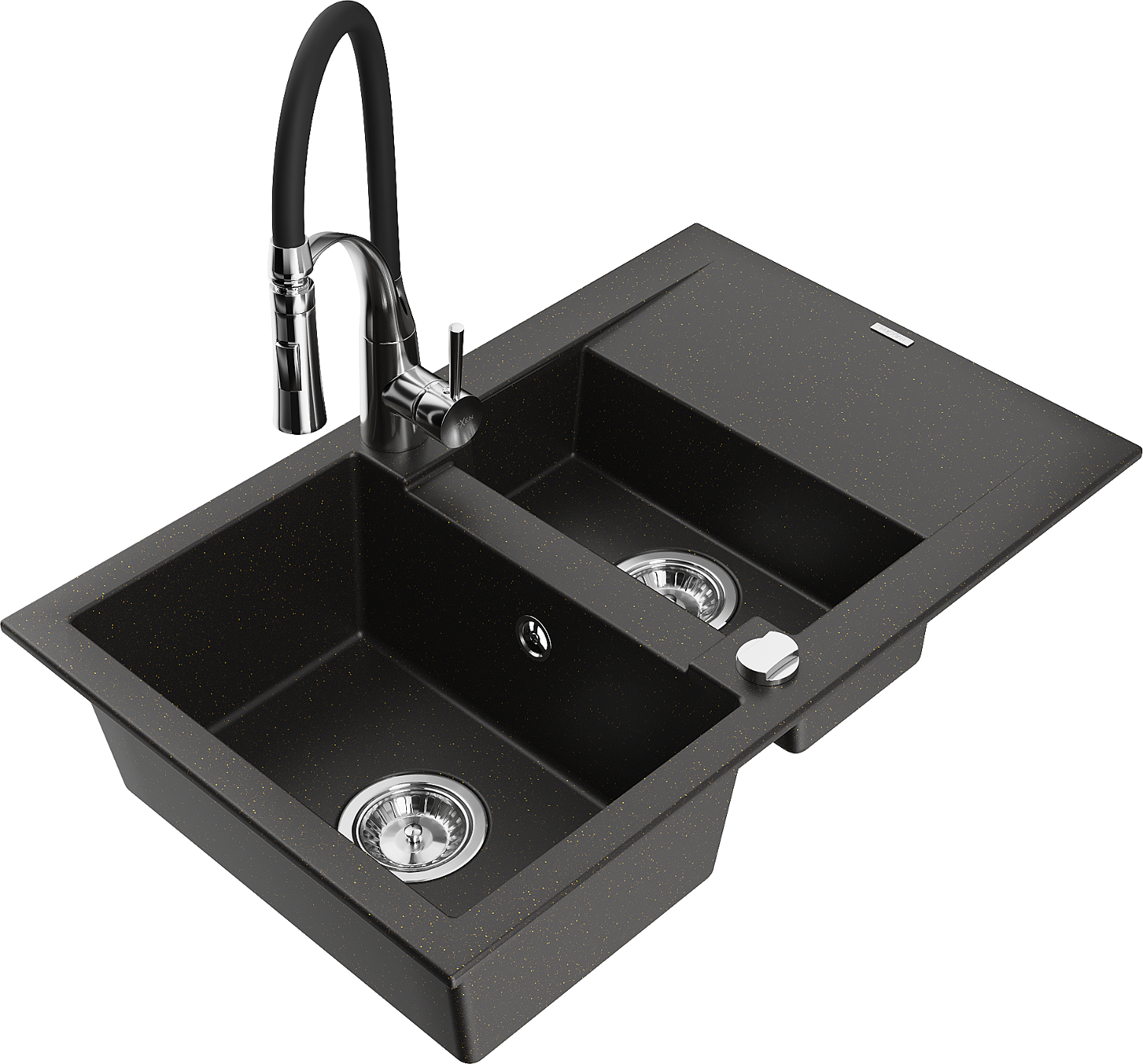 Mexen Gaspar lavello in granito 1,5 vasca con sgocciolatoio e rubinetto da cucina Aster, nero/oro metallizzato