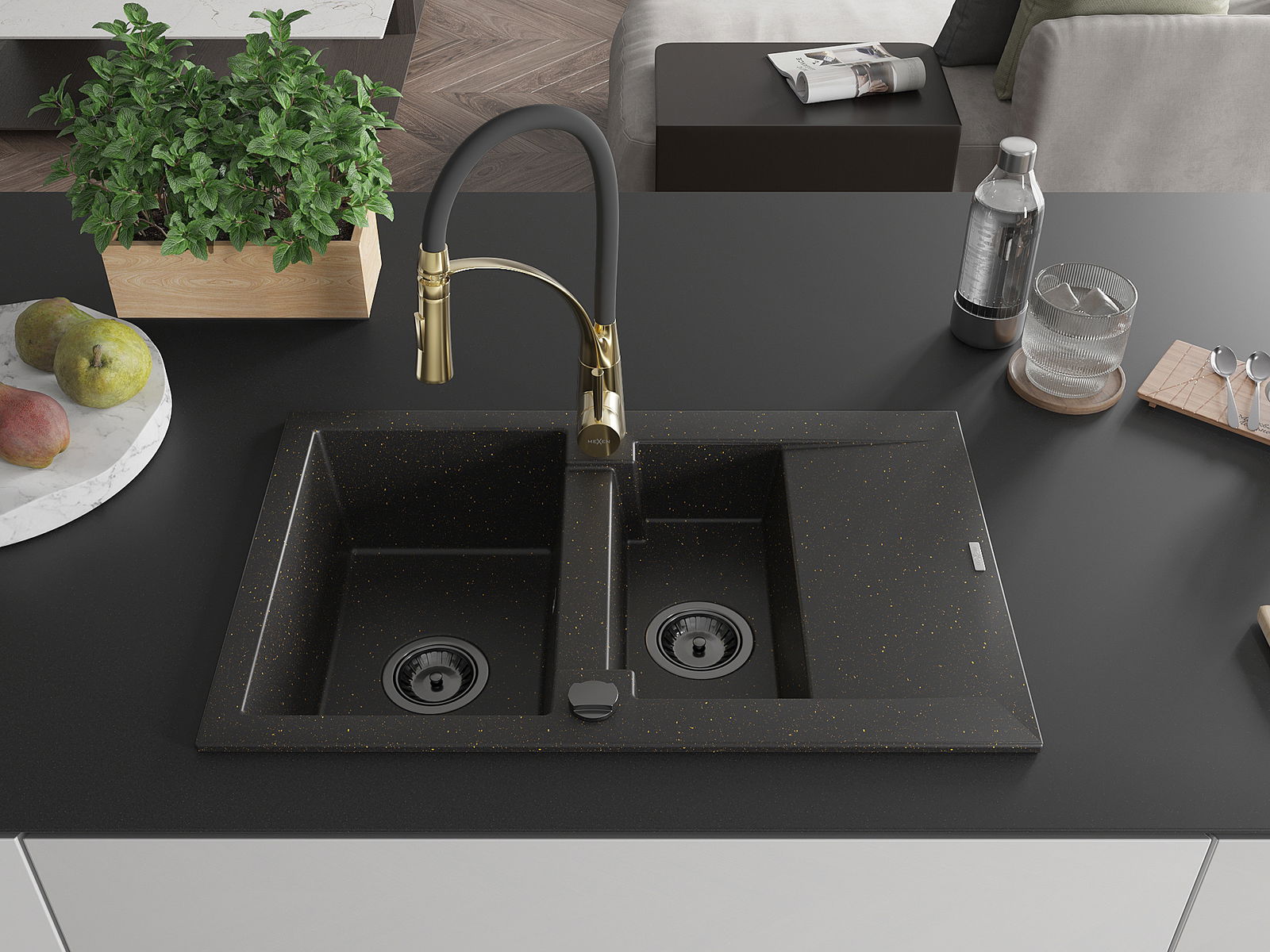Mexen Gaspar lavello in granito 1,5 vasche con scolapiatti e rubinetto da cucina Aster, nero/oro metallizzato