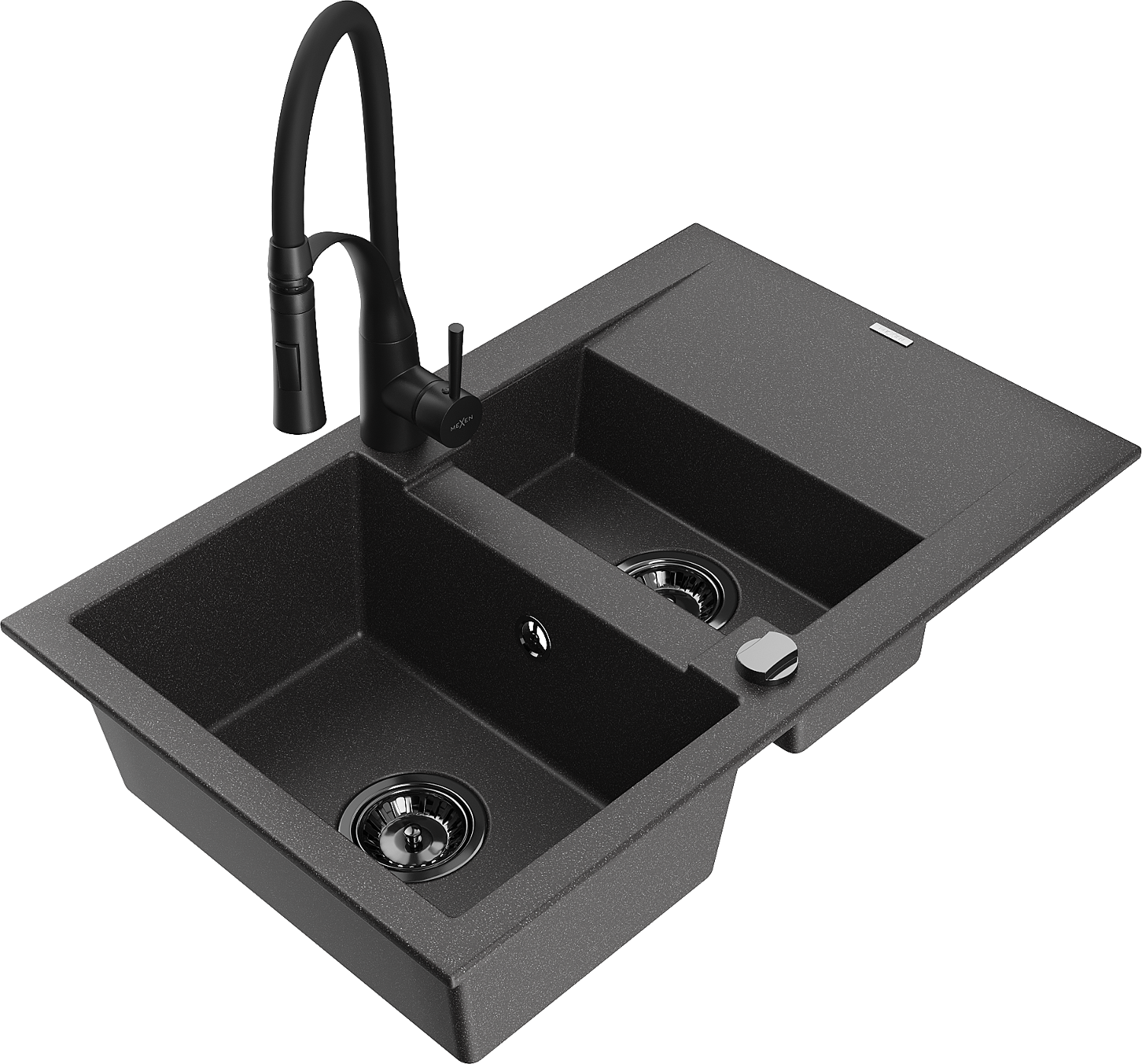 Mexen Gaspar lavello da cucina in granito 1,5 vasche con sgocciolatoio e rubinetto Aster, nero maculato - 6507-76-73450-70-B