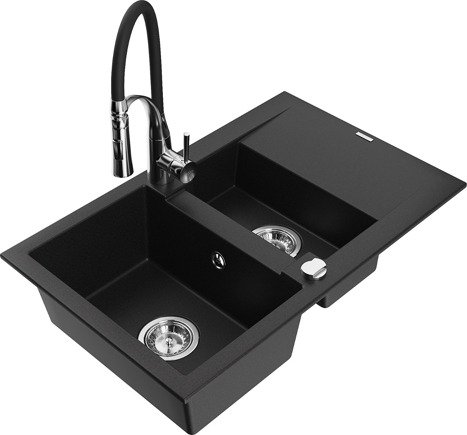 Mexen Gaspar lavello in granito con 1,5 vasche con scolapiatti e rubinetto da cucina Aster, nero - 6507-77-73450-07