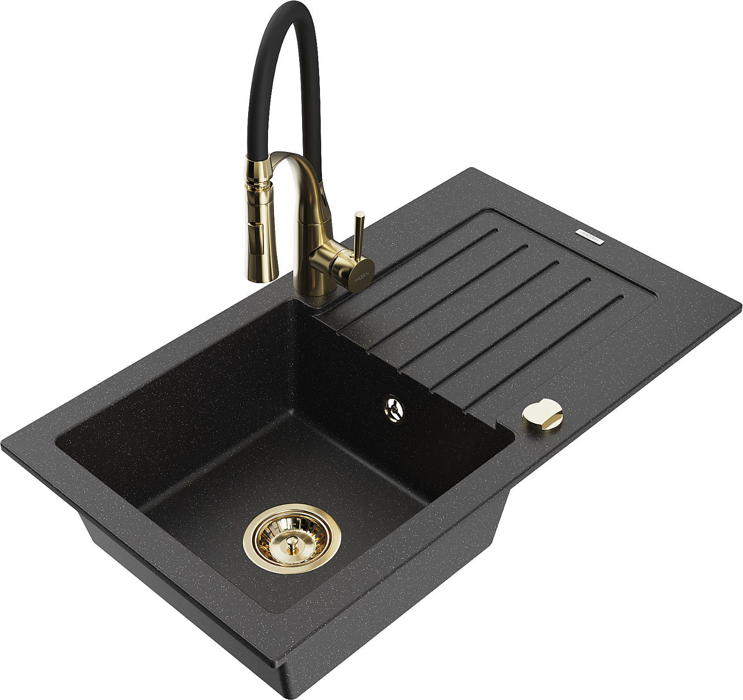 Mexen Pablo lavello in granito a 1 vasca con scolapiatti e rubinetto da cucina Aster, nero/argento metallizzato