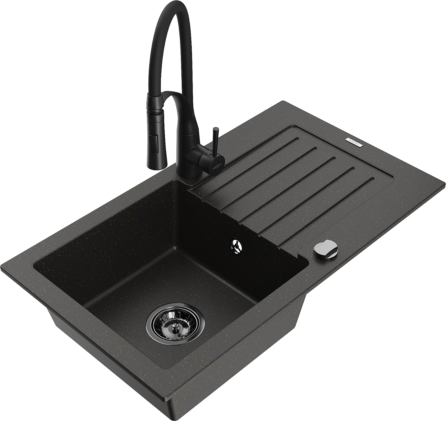 Mexen Pablo lavello in granito a 1 vasca con sgocciolatoio e rubinetto da cucina Aster, nero/oro metallizzato